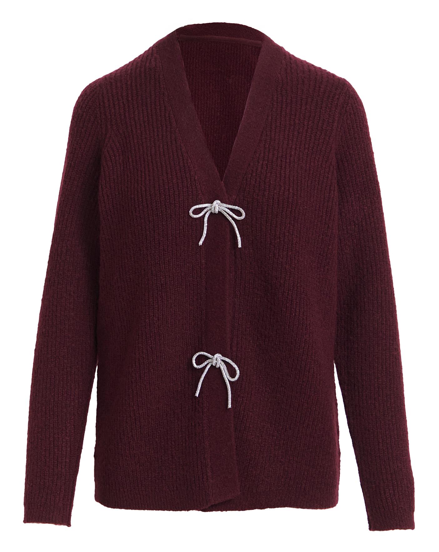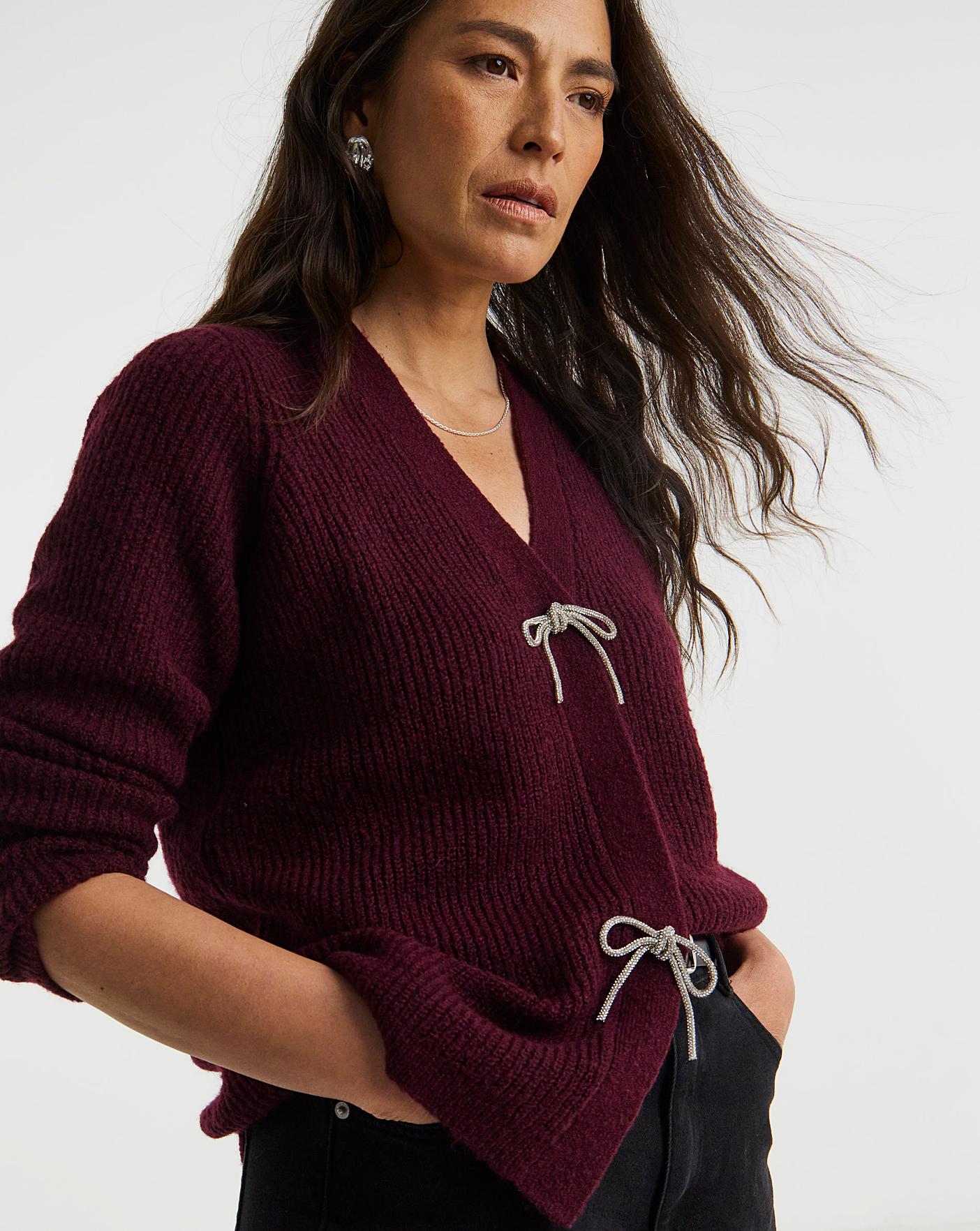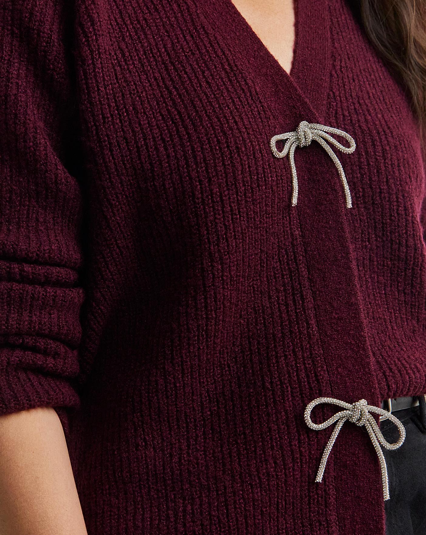 This cardigan in berry comes in a chunky knitted fabric featuring sequin bow buttons, long sleeves and a regular fit. Pair this with trousers or pants for a flattering look.