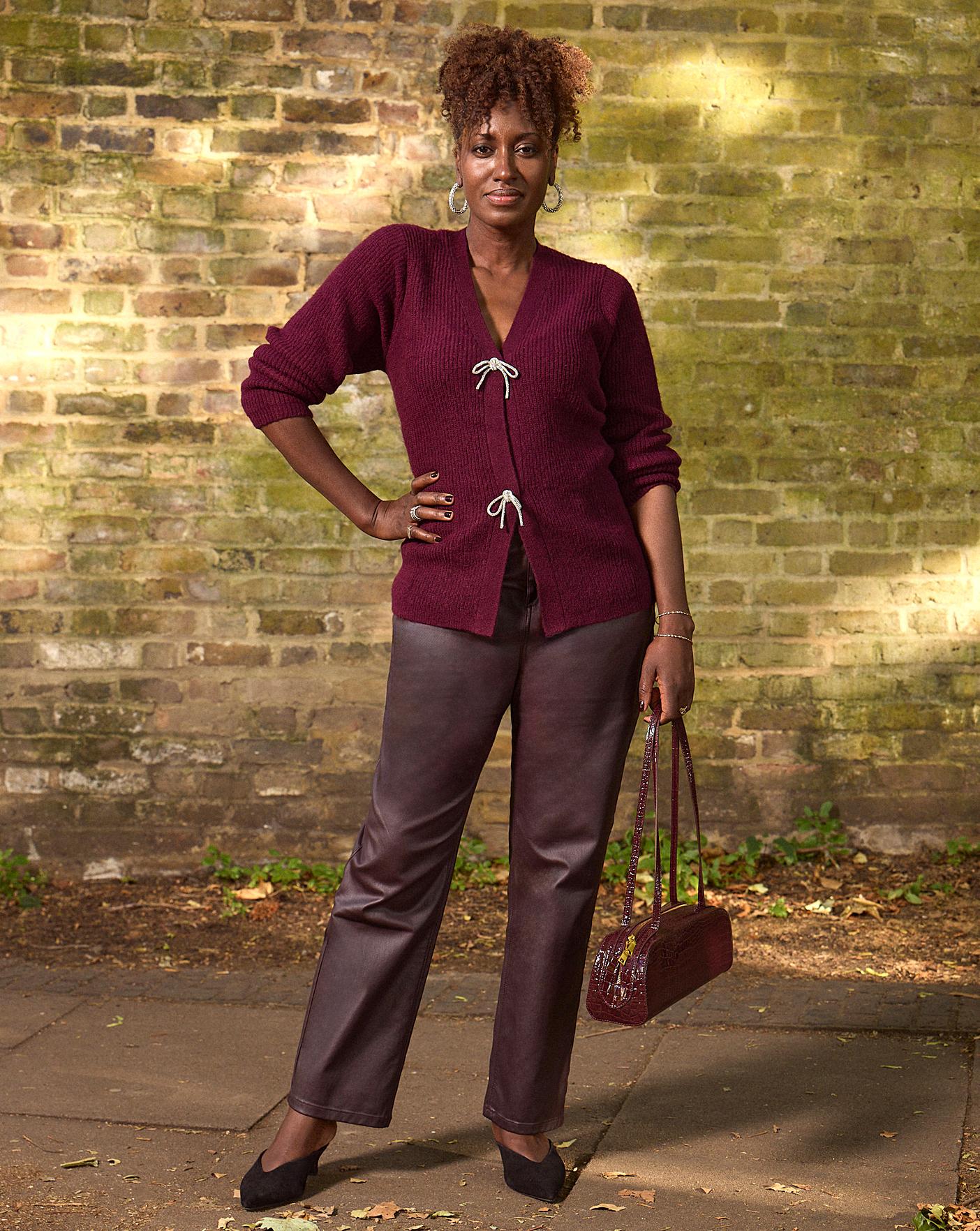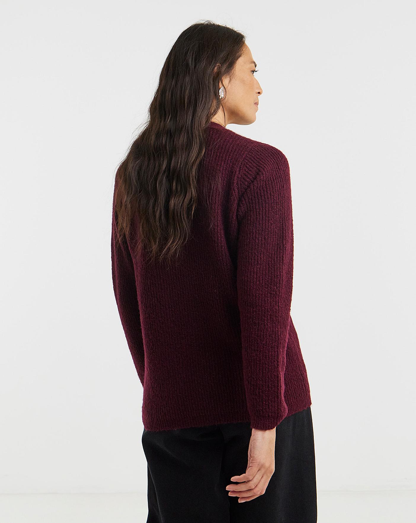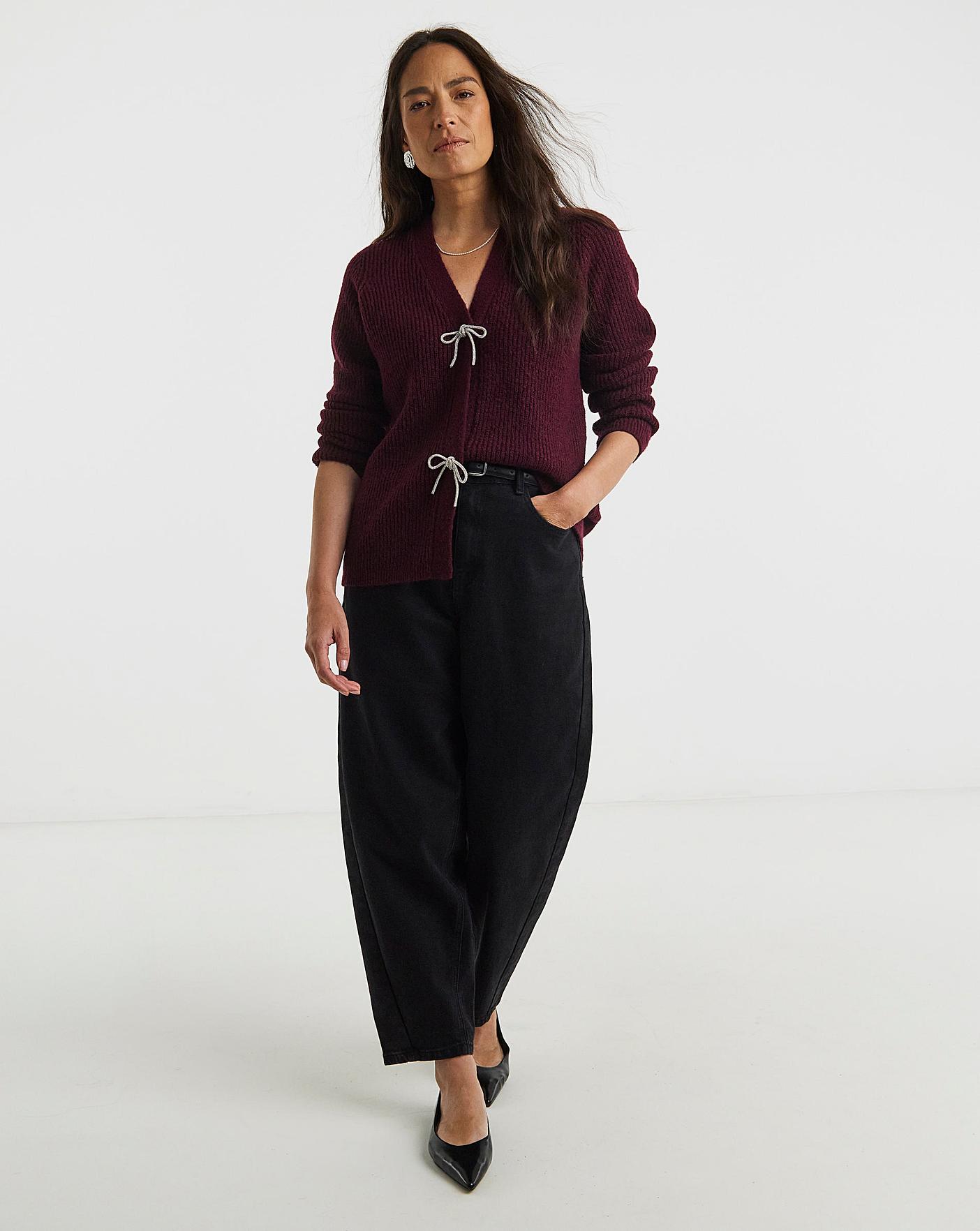 This cardigan in berry comes in a chunky knitted fabric featuring sequin bow buttons, long sleeves and a regular fit. Pair this with trousers or pants for a flattering look.