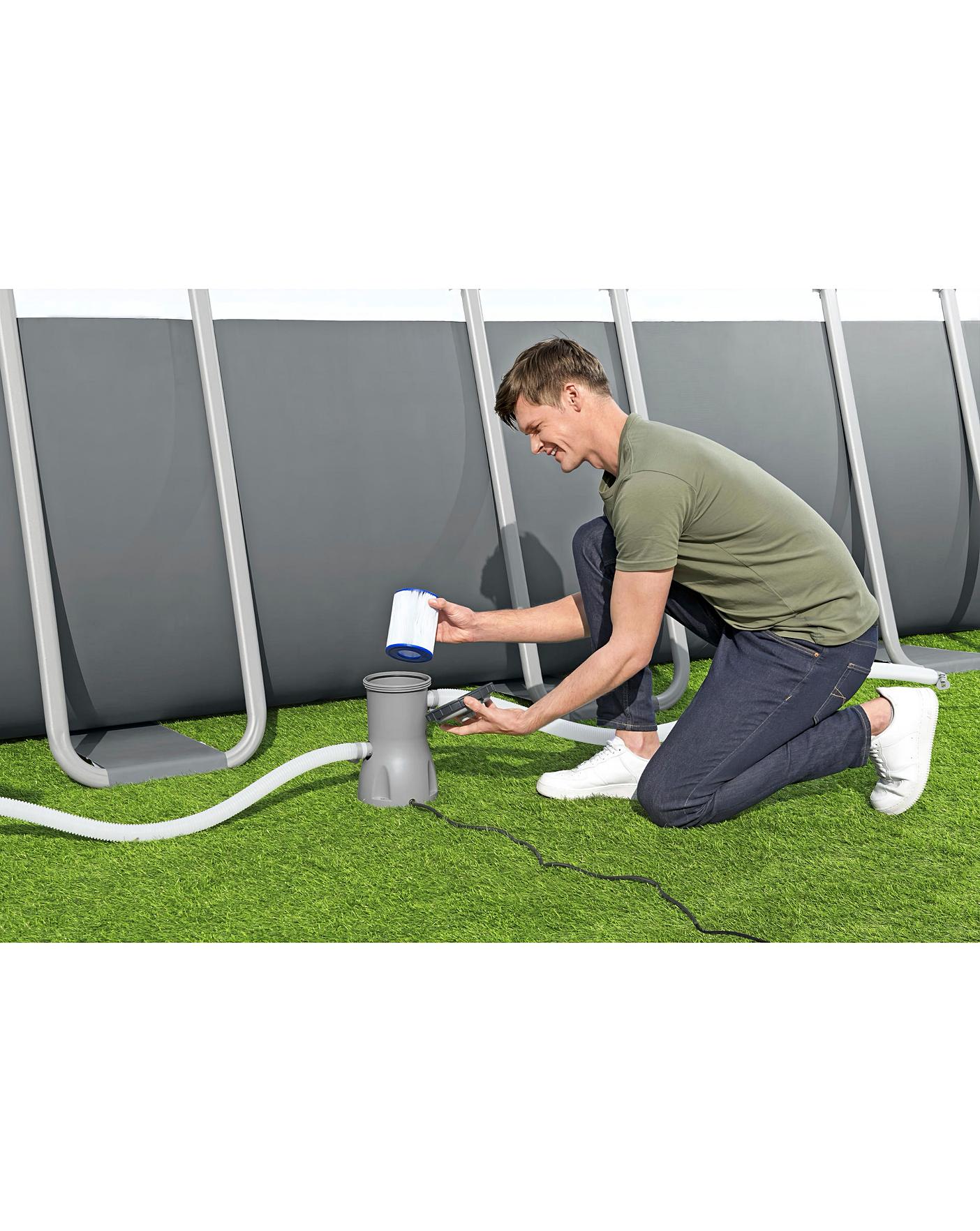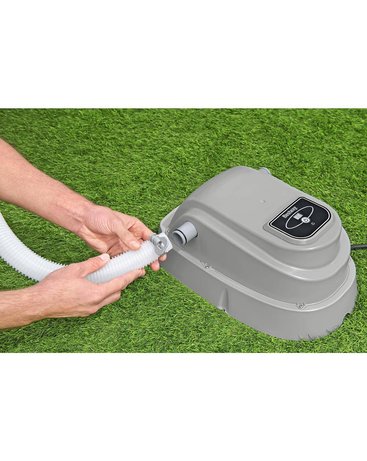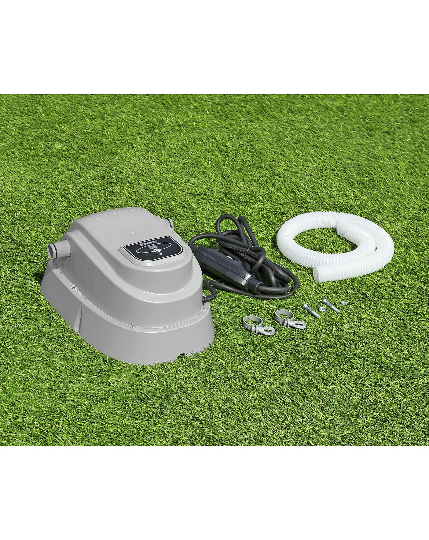 The Bestway pool heater is simple and effective to warm up water in your swimming pool. The pool heater is powered through an electrical outlet. It comes with two hoses and attachments, one of which connects the heater to a filter pump and the other to a pool. Water is pumped into the heater via the filter pump, warmed up as it passes through and then pumped back into the pool. The heater is compatible with pools measuring 15ft or smaller (water volume of 400-500gal) and filter pumps or sand filters with a flow rate of 1,000 gal/hr (3,785L). Depending on pool size and water temperature the heater can take anywhere from 12 hours to three days to reach your desired temperature.