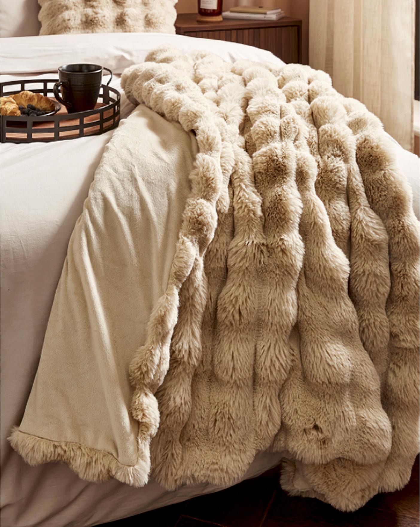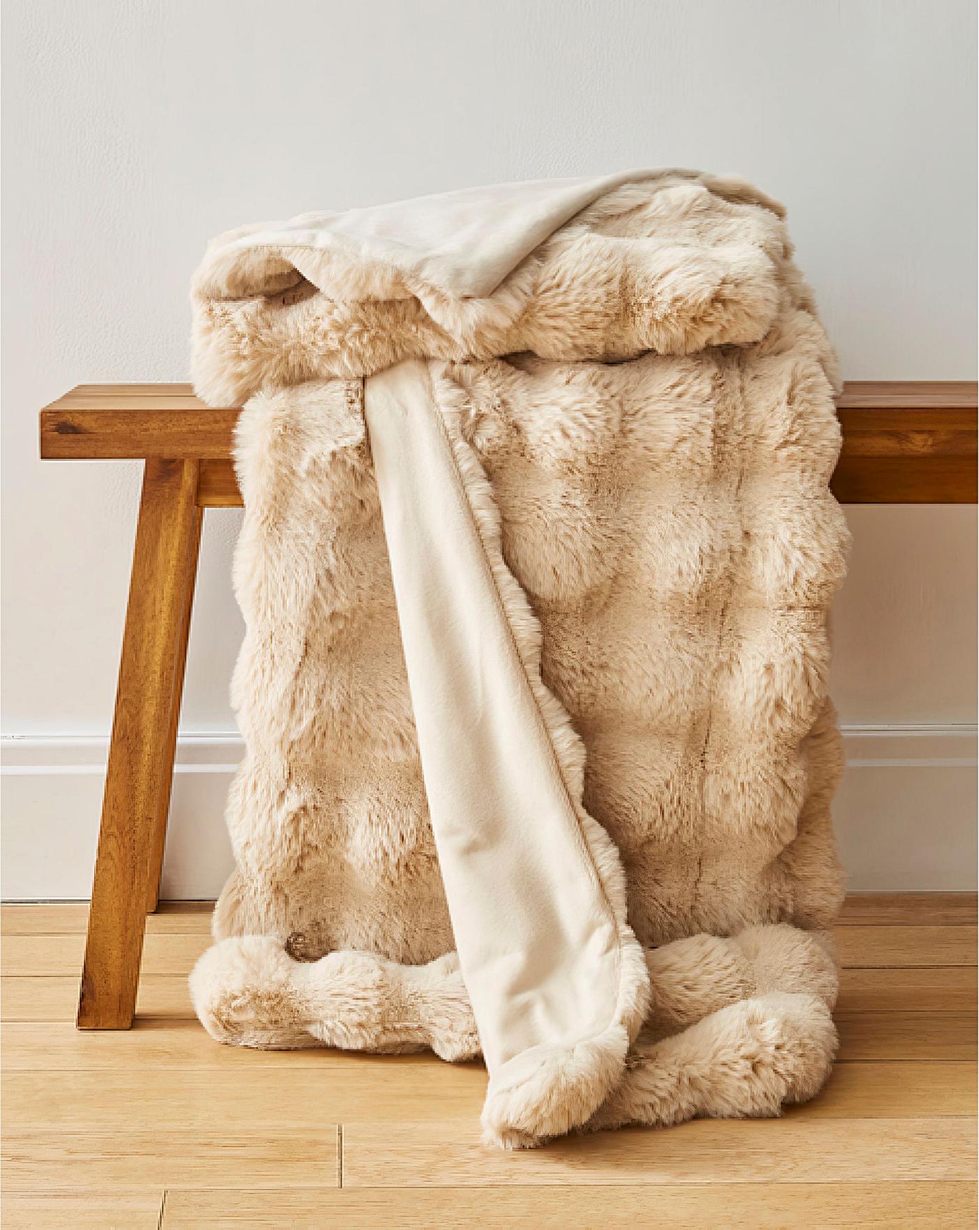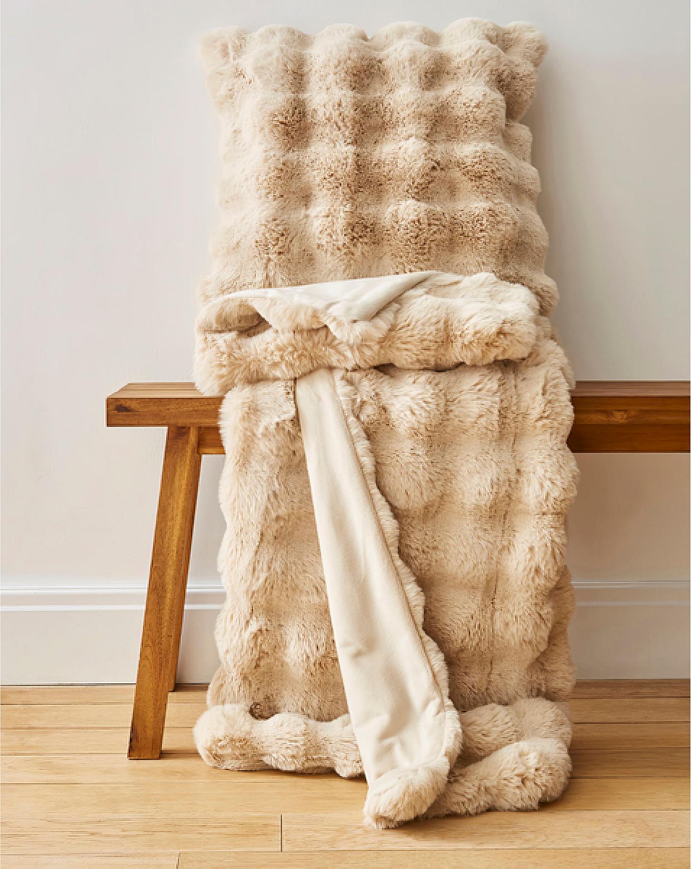 Throw with fleece back and textured, bubble faux fur front. Wash at 30 degrees. Tumble dry on low. Do not iron, bleach or dry clean. 100% Polyester.