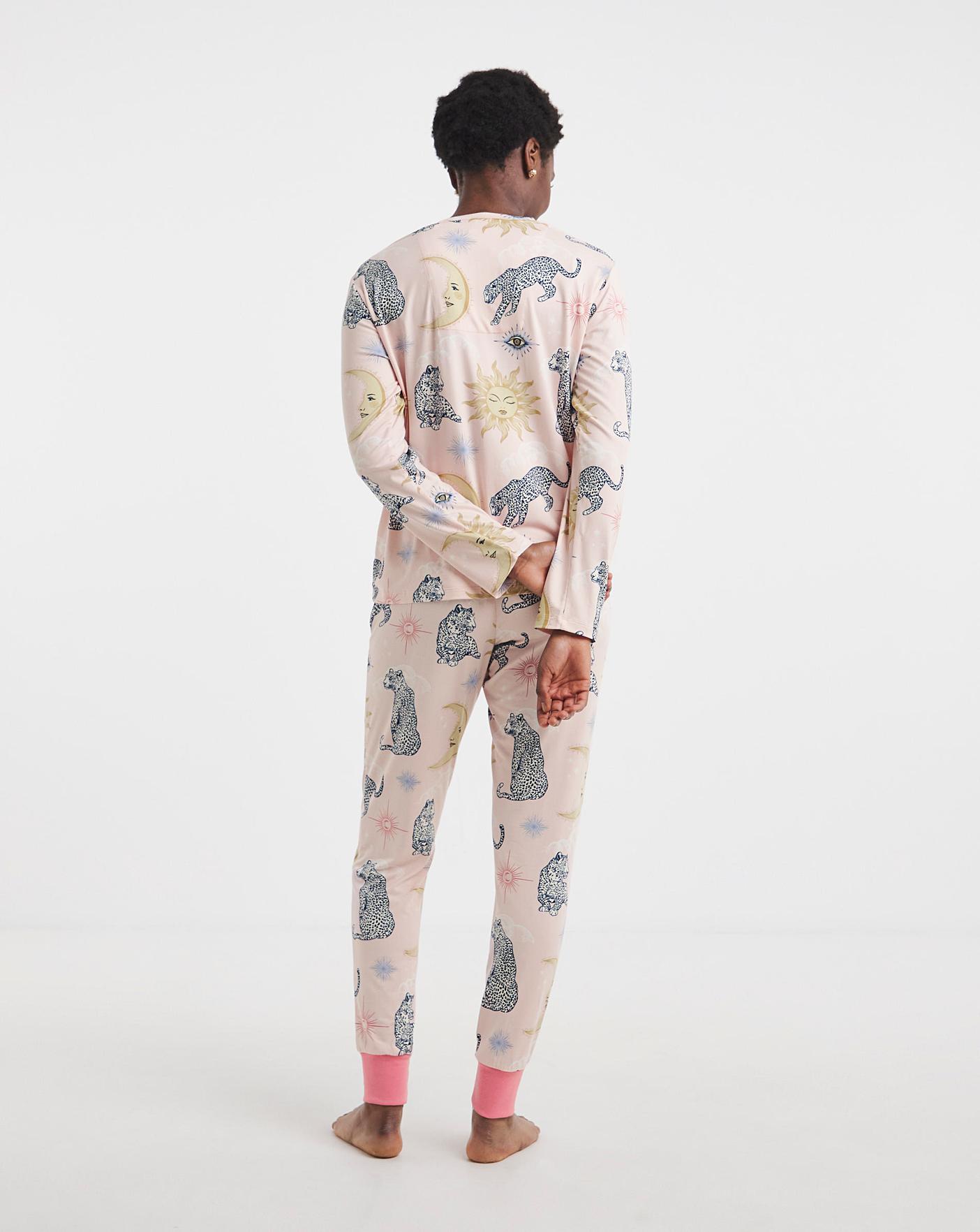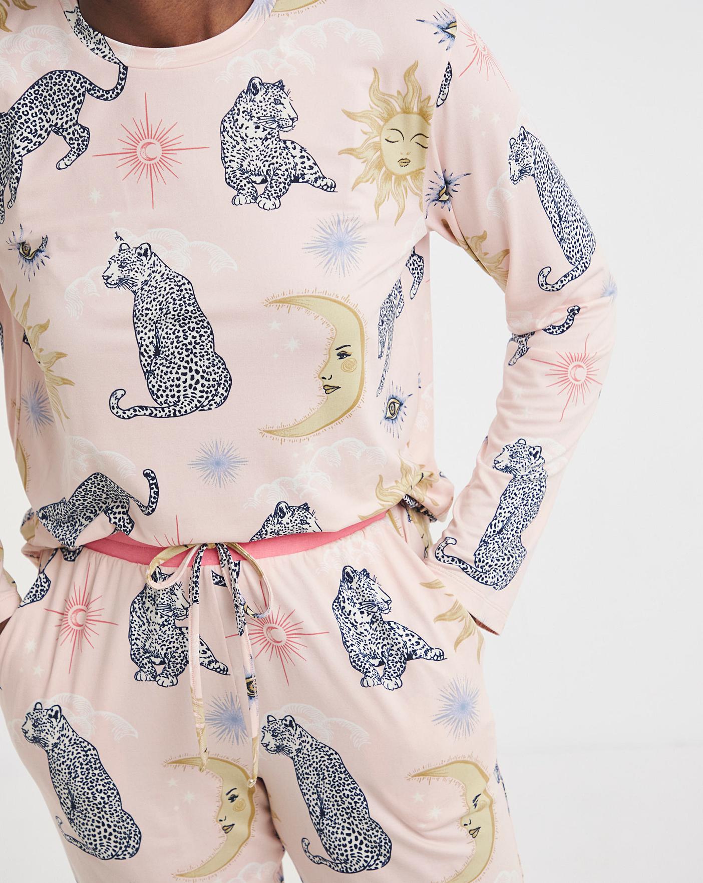 Relax in style with this adorable crew neck pyjama set from Chelsea Peers in a fun leopard print.This set features a long-sleeved crew neck pyjama top.It has pyjama bottoms with an elasticated waistband for the most perfect fit. The set also has sideseam pockets and cuffed hem and waistband.