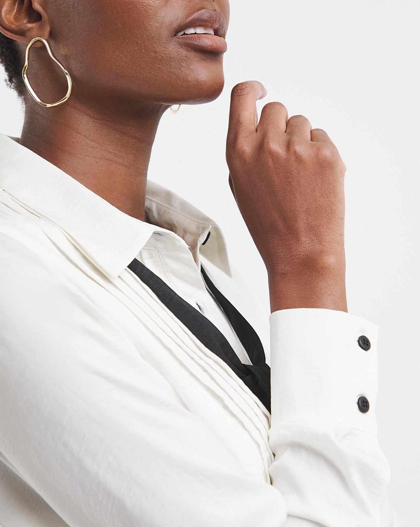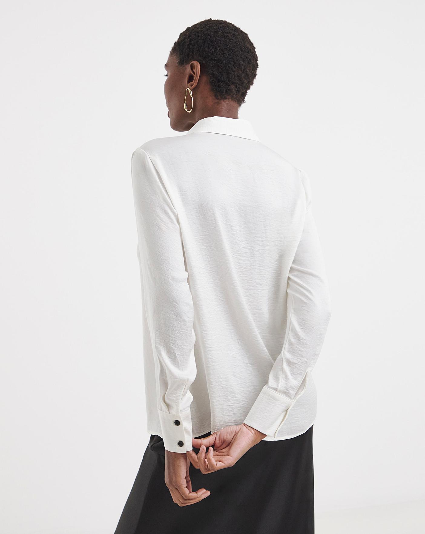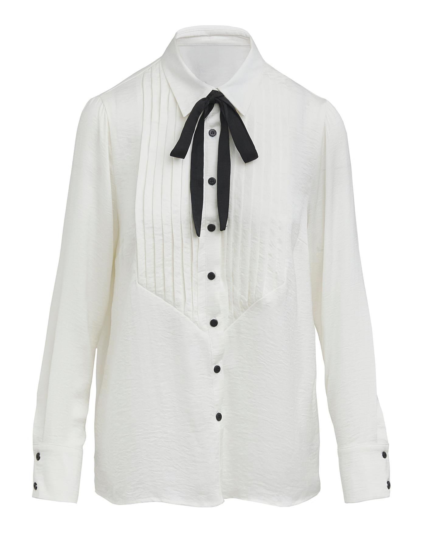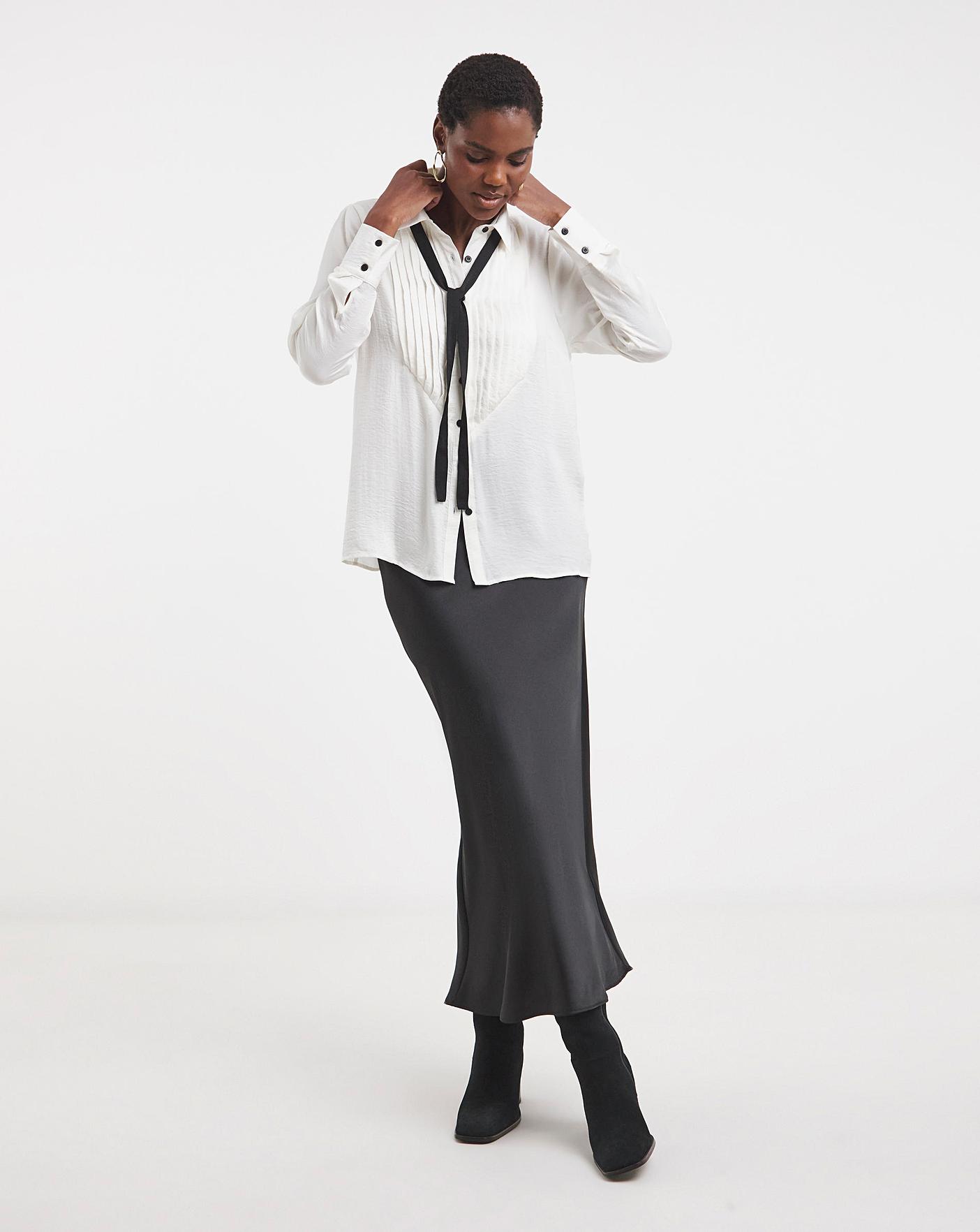 Make a statement this season with our hammered satin shirt, designed to feature on-trend tux detailing and a contrast tie. This piece will make any outfit look fresh and effortlessly chic.