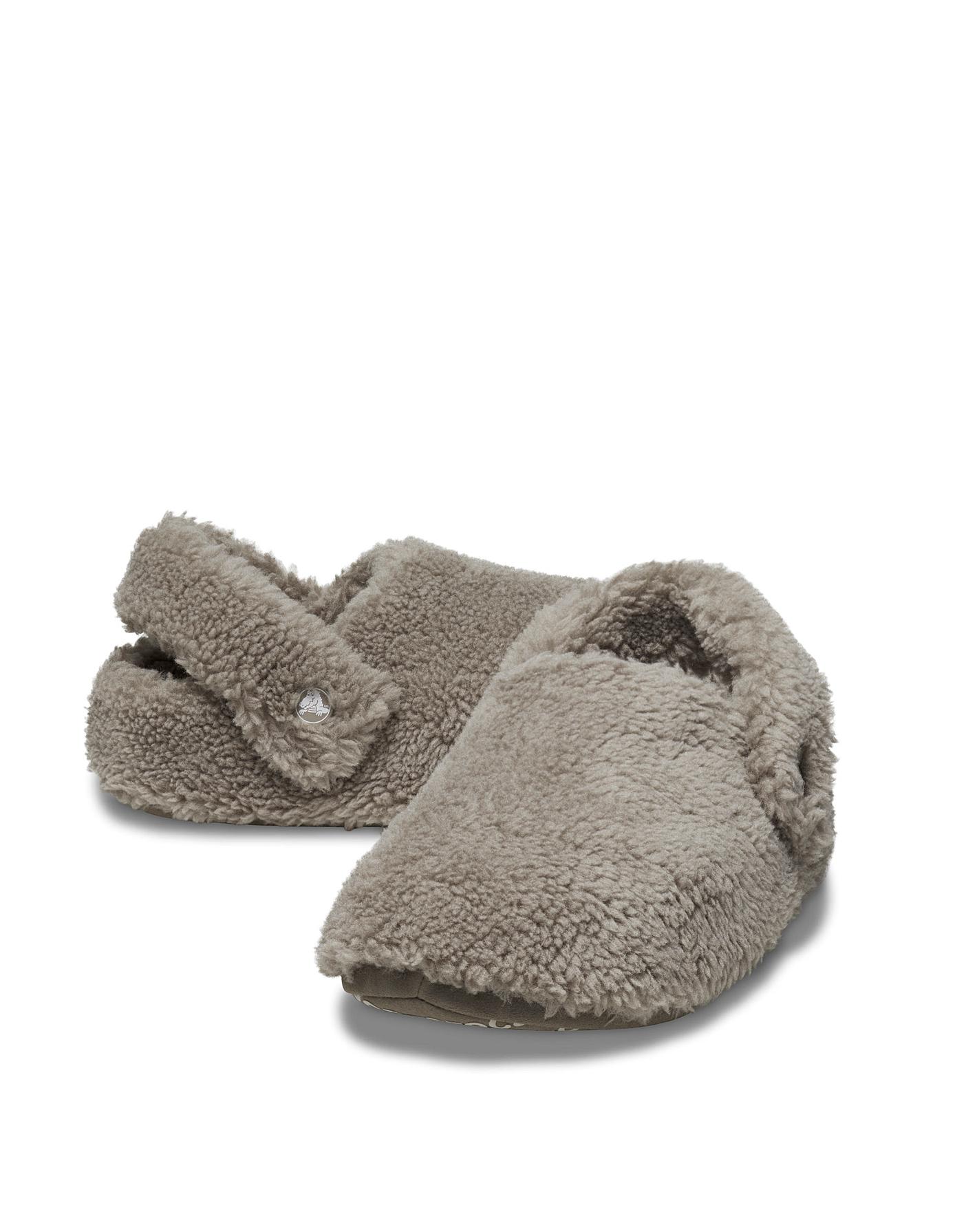 No plans are the best plans for our fuzzy all over classic cozzzy slippers. We have transformed tour iconic classic clog into a shoe for those days where relaxing is on the agenda. Warm hell to toe faux fur shearling fuzz, sink in soft underfoot feel, grippy textured logos