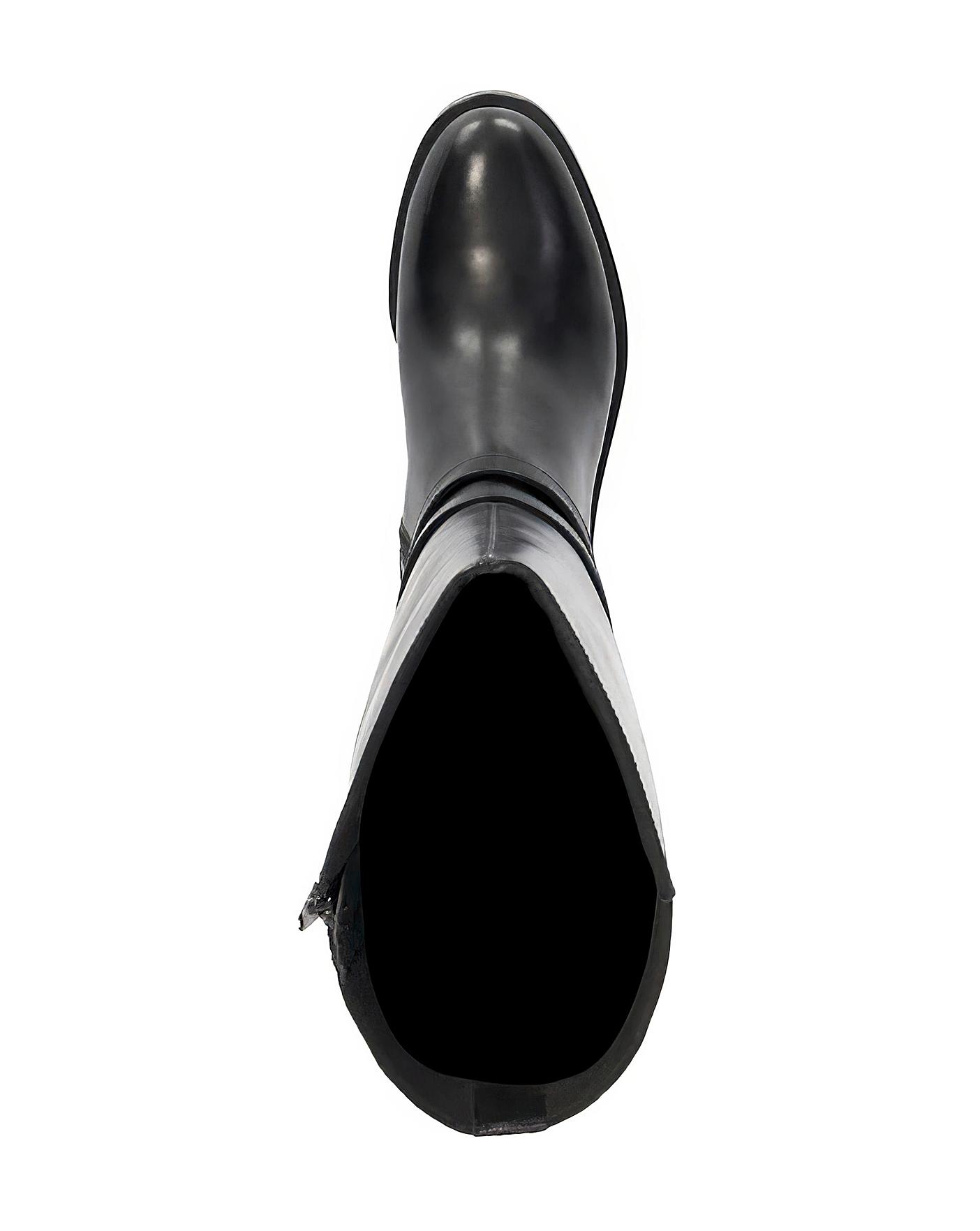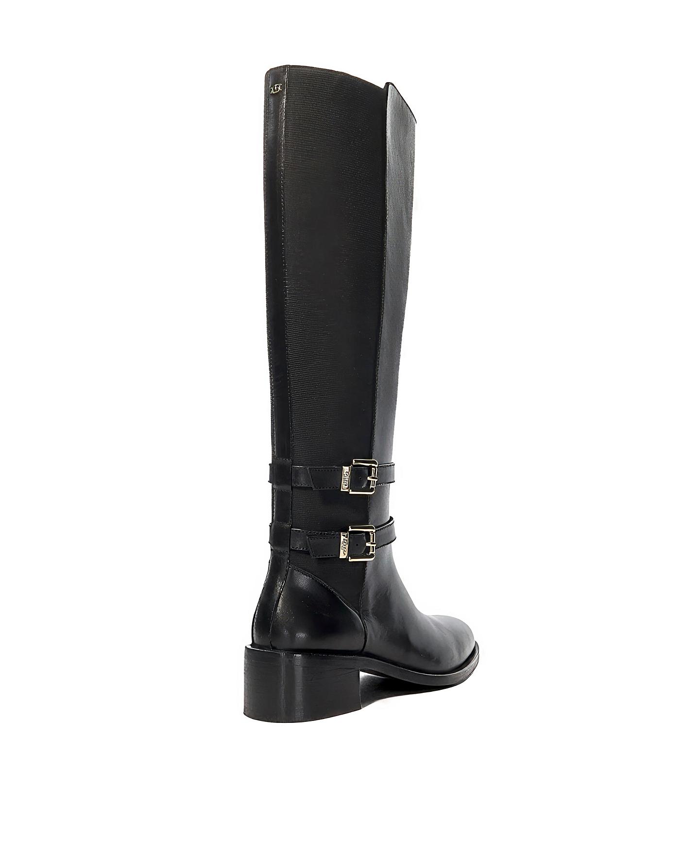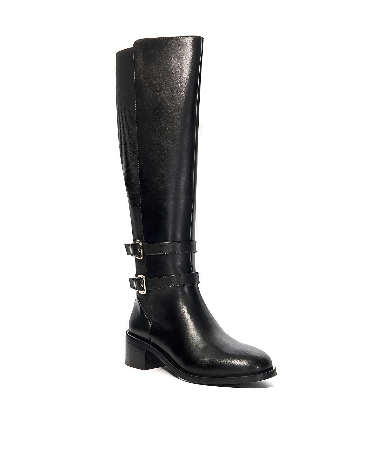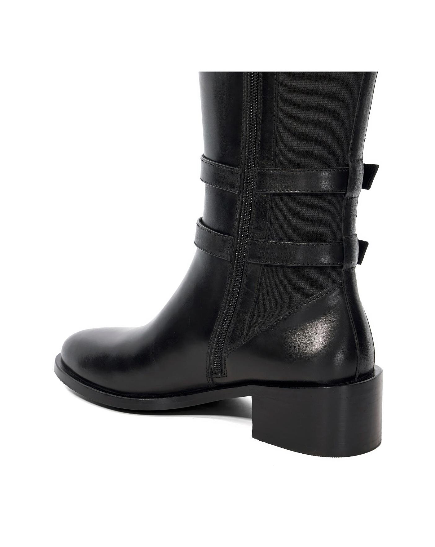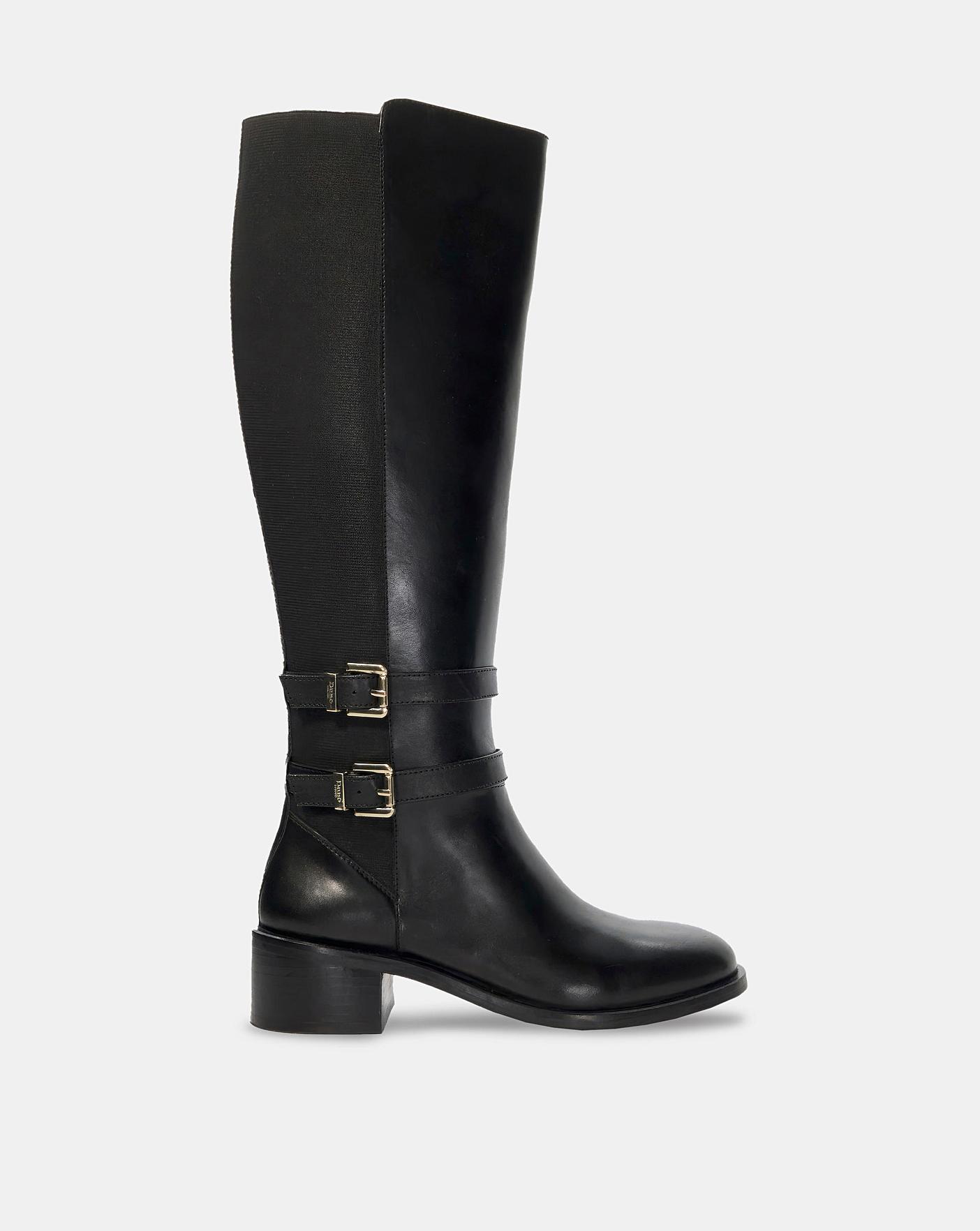 Crafted from the finest leather our Tatter knee-high boots have been designed with two branded gold buckles on the ankle. Finished with a side zip the addition of an elasticated side panel ensure they fit the leg perfectly. Resting on a comfortable low block heel this round-toed silhouette offers a timeless aesthetic with a contemporary touch.