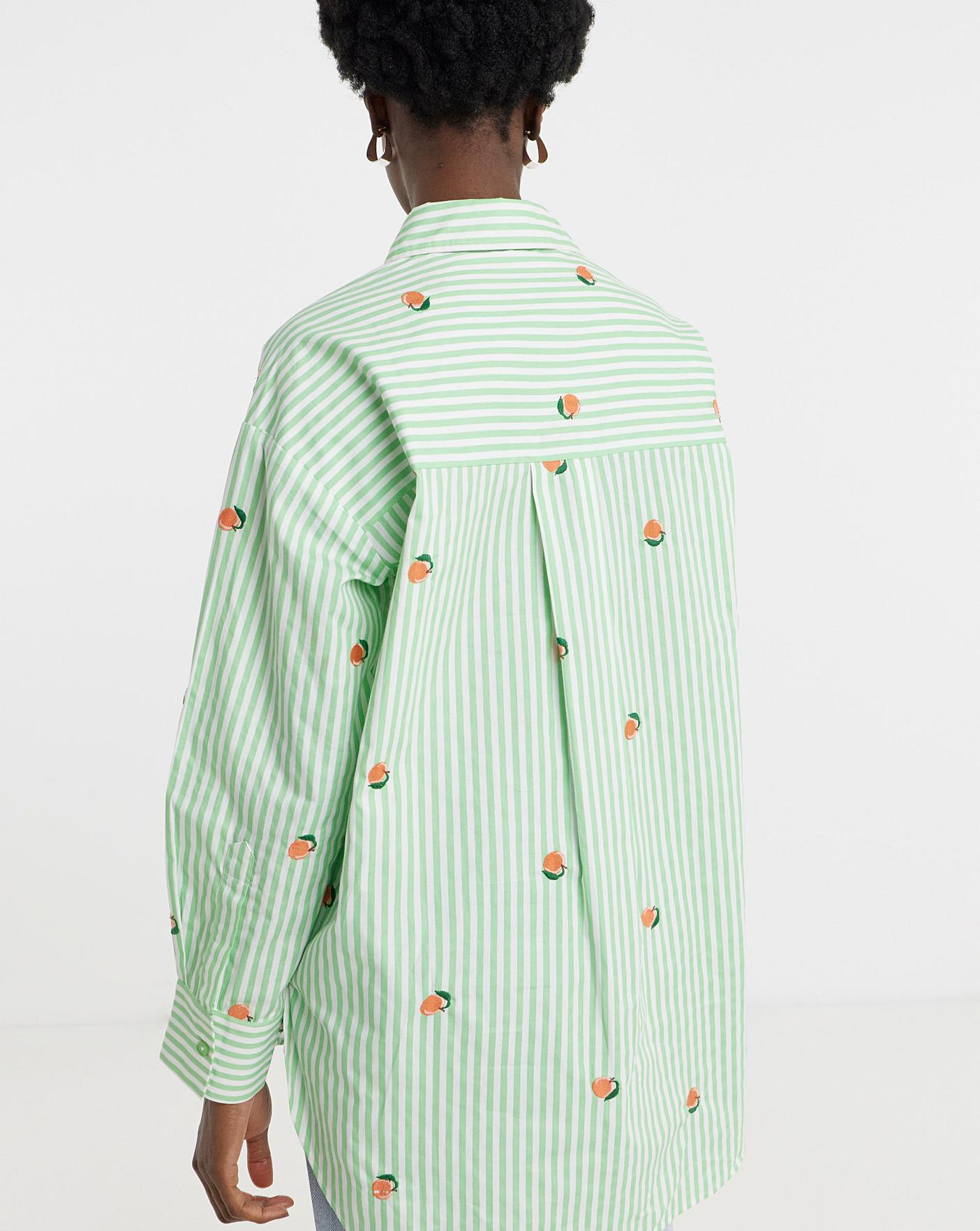 This shirt adds a fun update to a classic wardrobe staple with its embroidered peach design. Featuring an oversized fit, long sleeves and button down fastening.