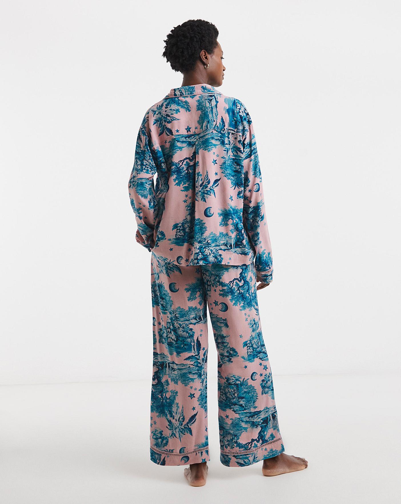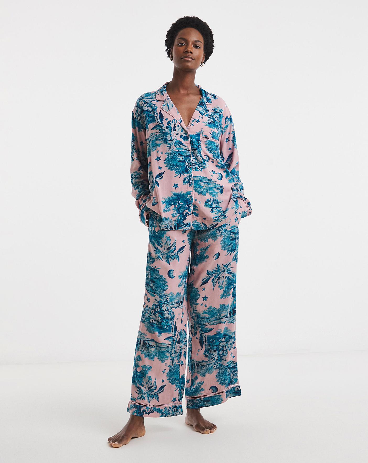 Made from lightweight viscose fabric, this pyjama is from our viscose range which prodives maximum comfort.This set hasa regular fit with long sleeves and full length pants.It is in a lovely blue and pink design. Our viscose range is designed with comfort, fit and breathability in mind. Shop the range online now.