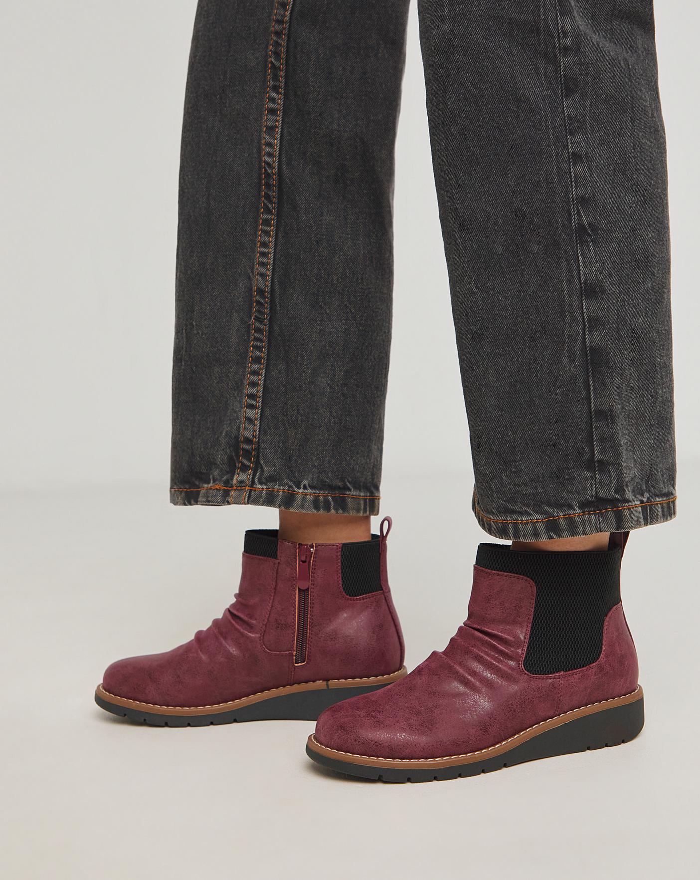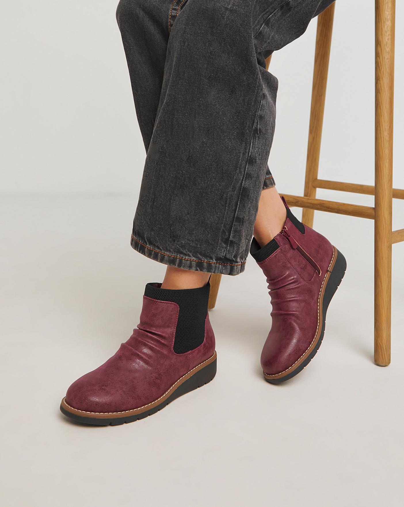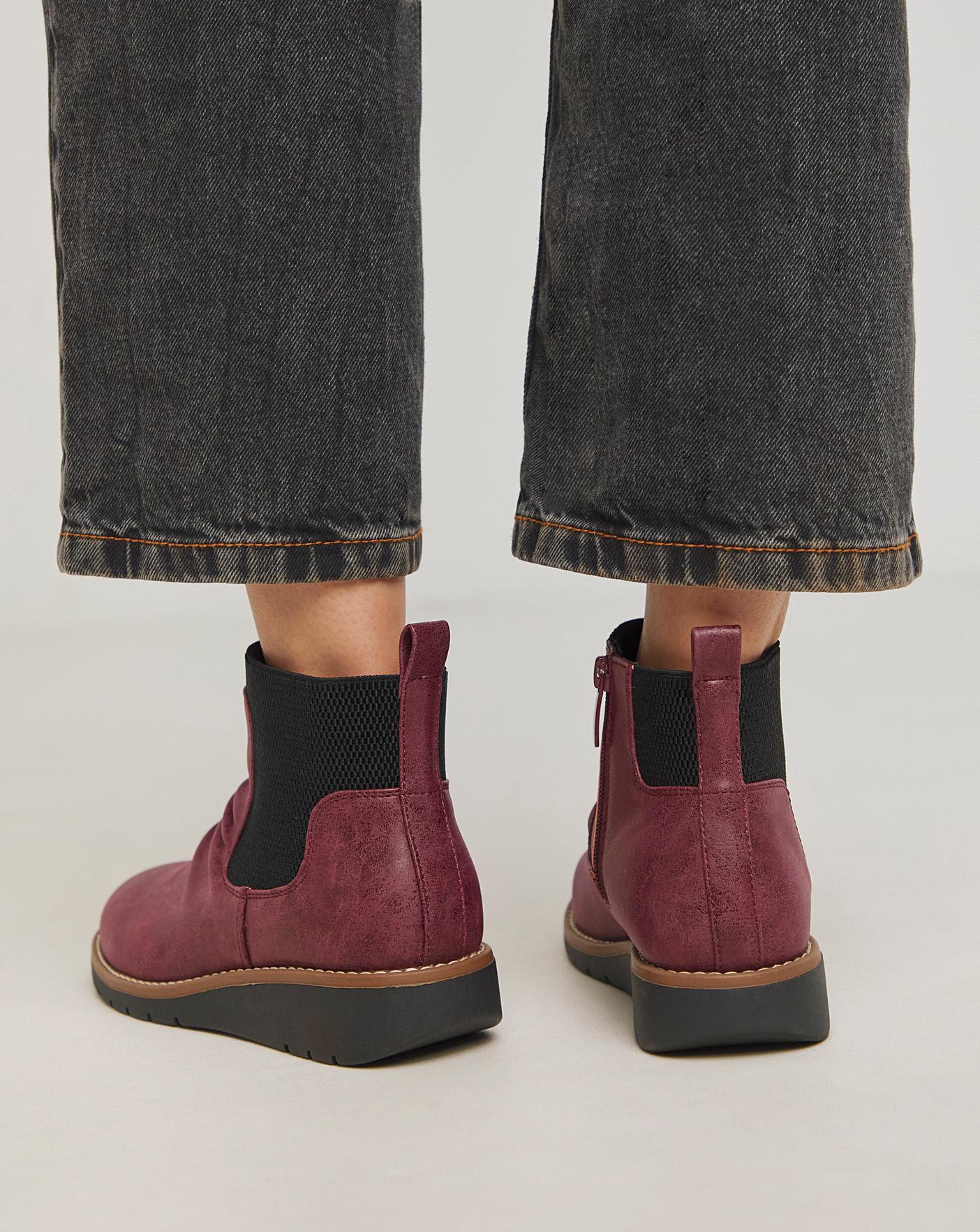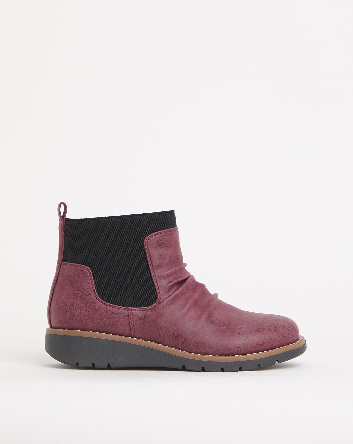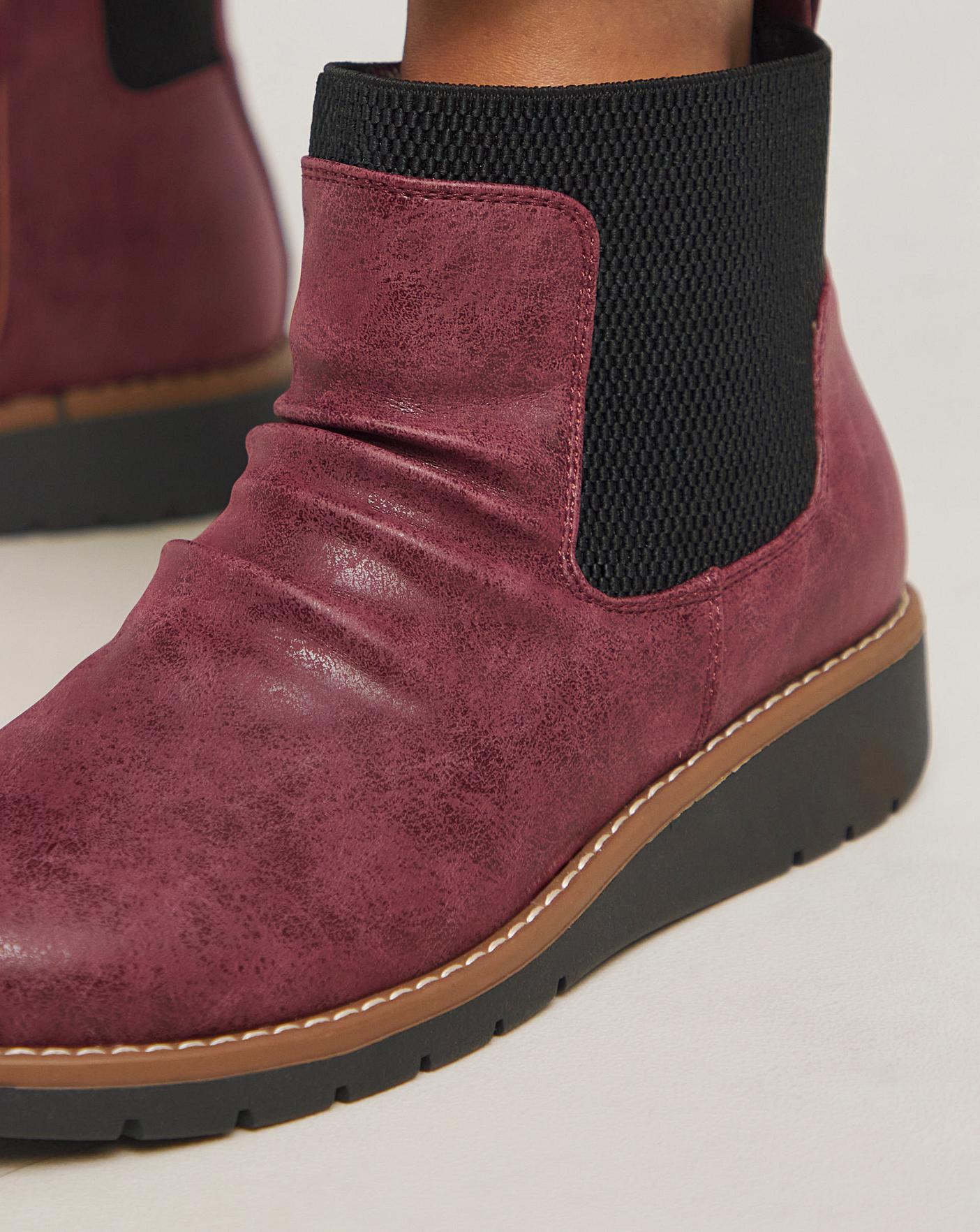 These low ankle chelsea boots are sure to give you all day comfort. Featuring a ruched upper, elasticated panel around the ankle, low wedge heel and padded sock.