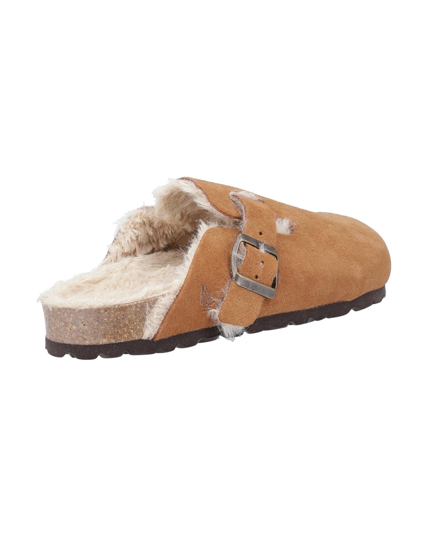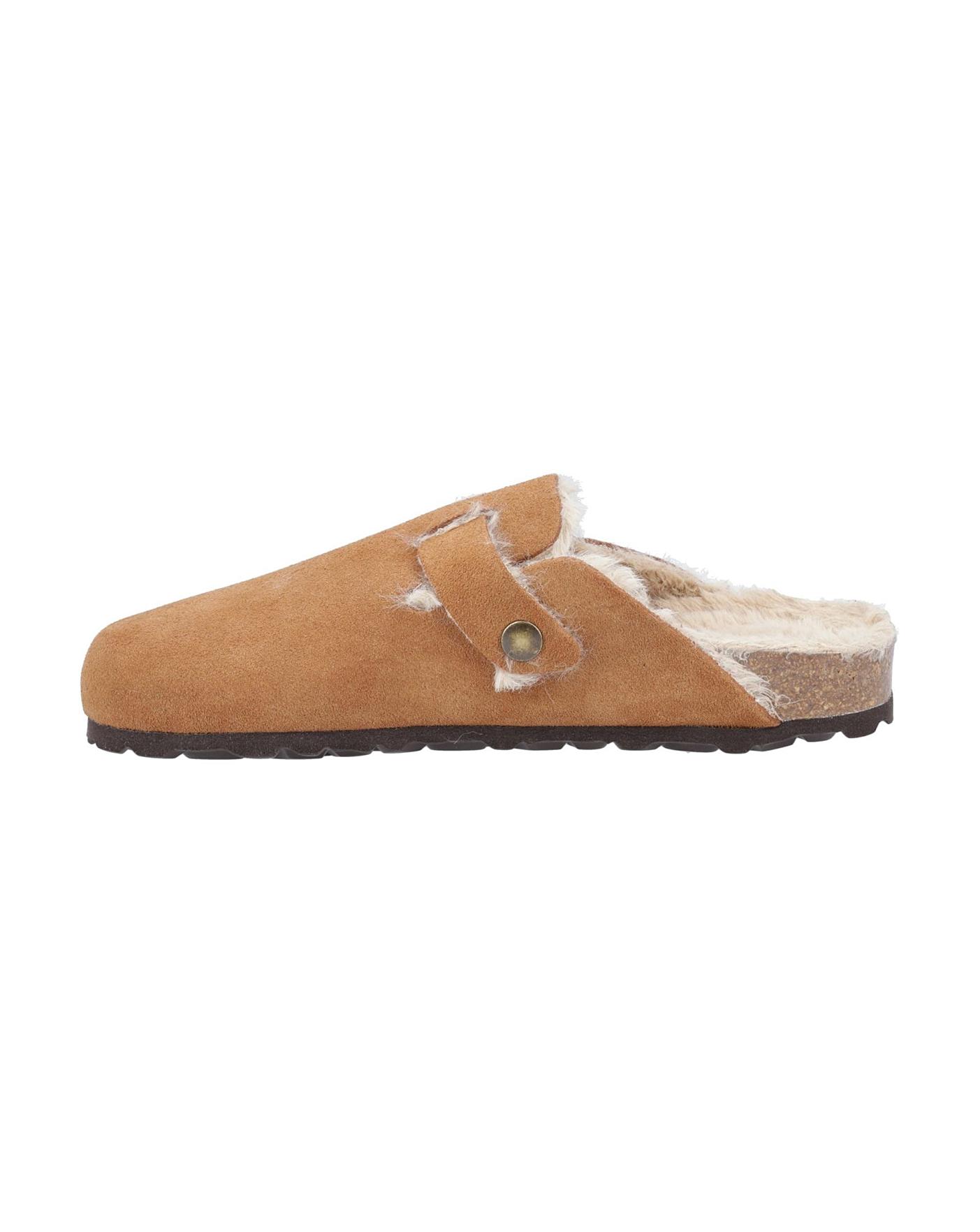 Real Suede Upper. Easy Slip On Closed Toe Mule Styling. Contoured Faux Wool Footbed.