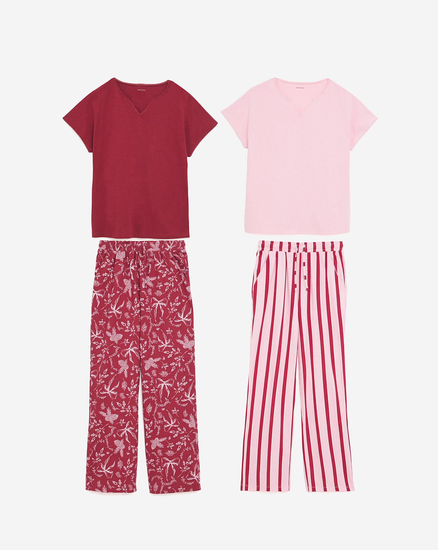 Elevate your nightwear collection in cotton blend comfort with our lightweight pyjama 2 pack.This set has a regular fit.The 4 piece set is easy to mix and match.The set comprises of a short sleeve top and a full length bottom.It is made out of a breathable fabric to maximise comfort.It has an elasticated waistband. The sets have printed bottoms and are paired with a solid coloured tops.All of our pyjama packs are designed to maximise both style & value, whilst keeping fit in mind, for guaranteed comfort. Shop our value range online now, in multiple prints & colourways.