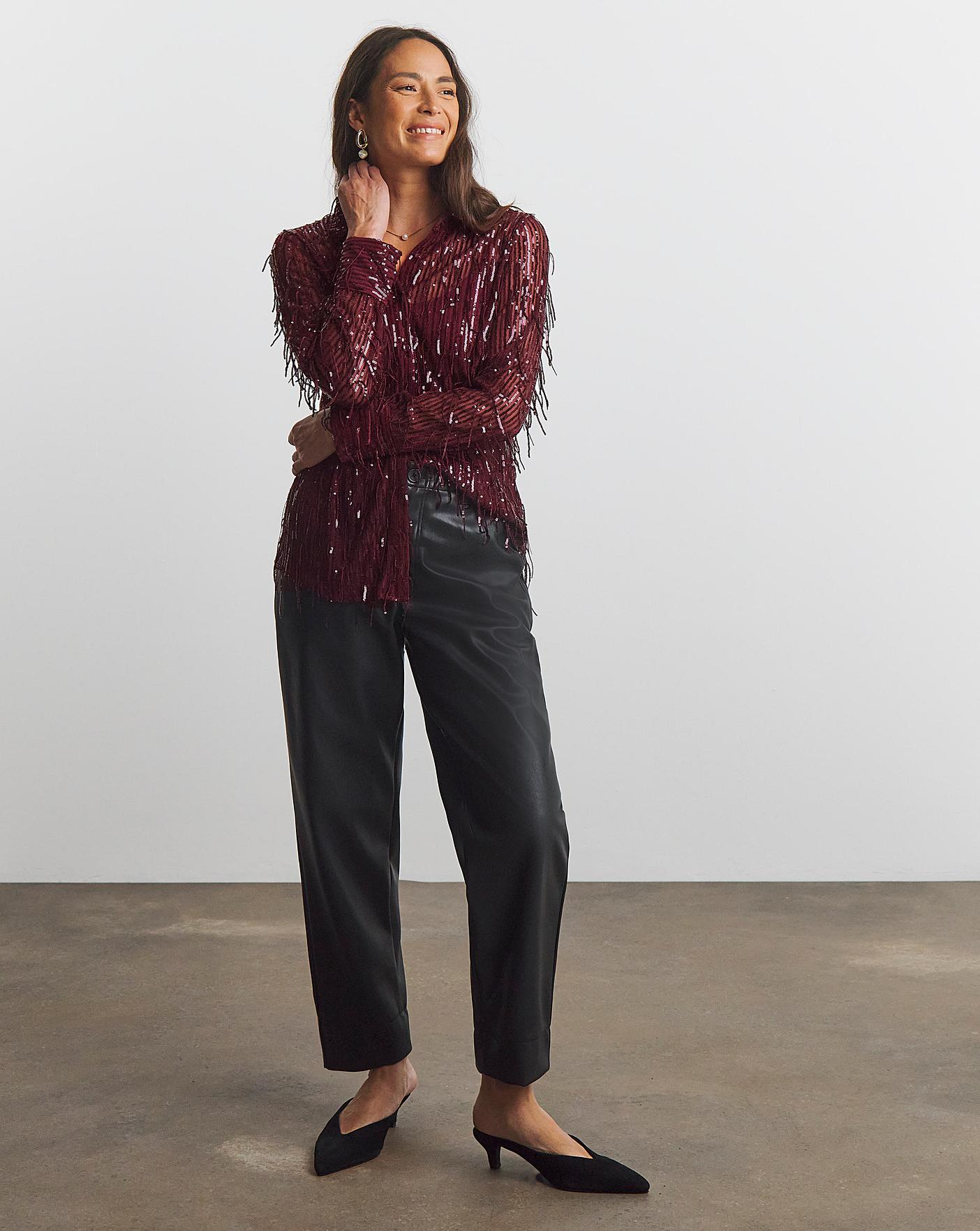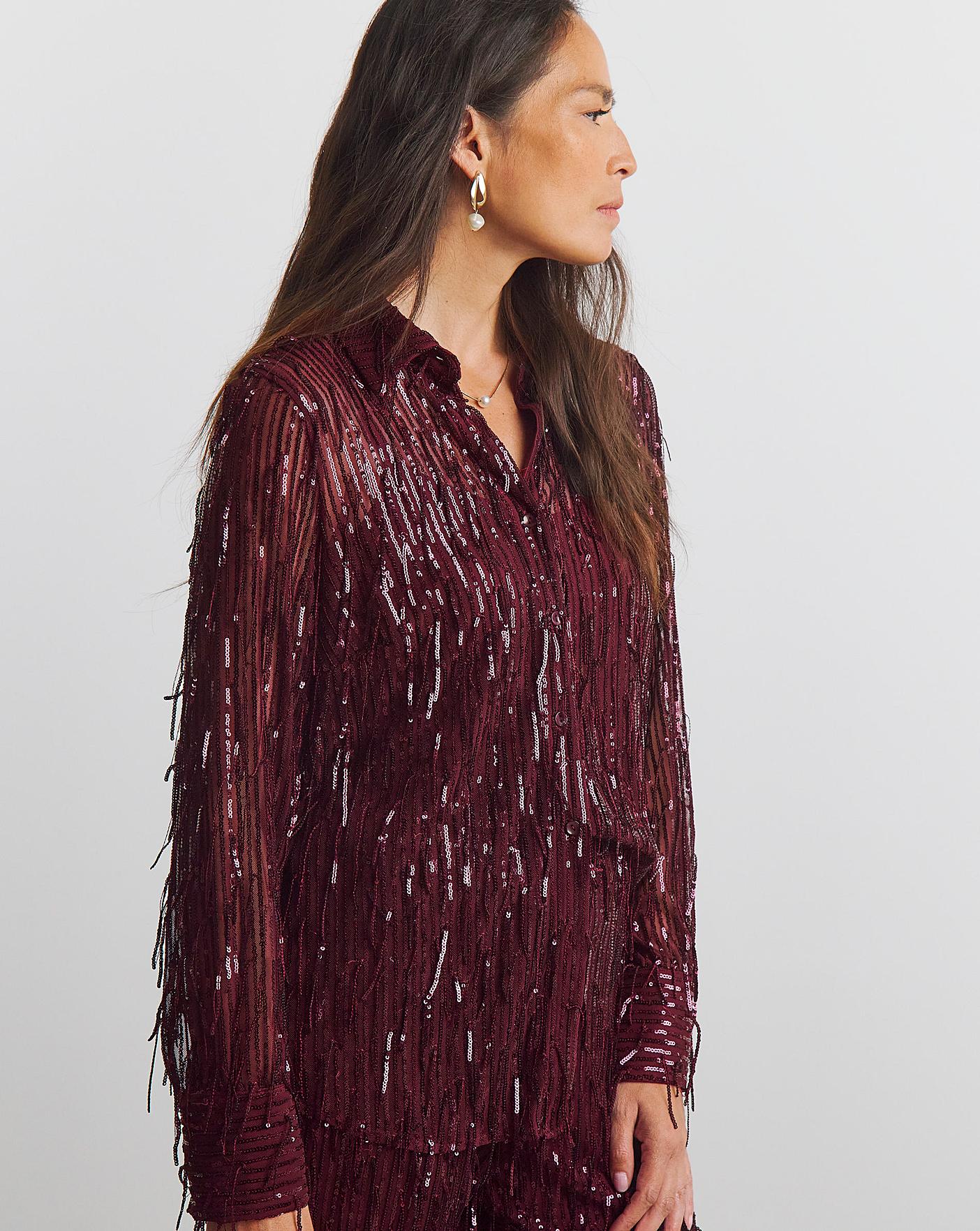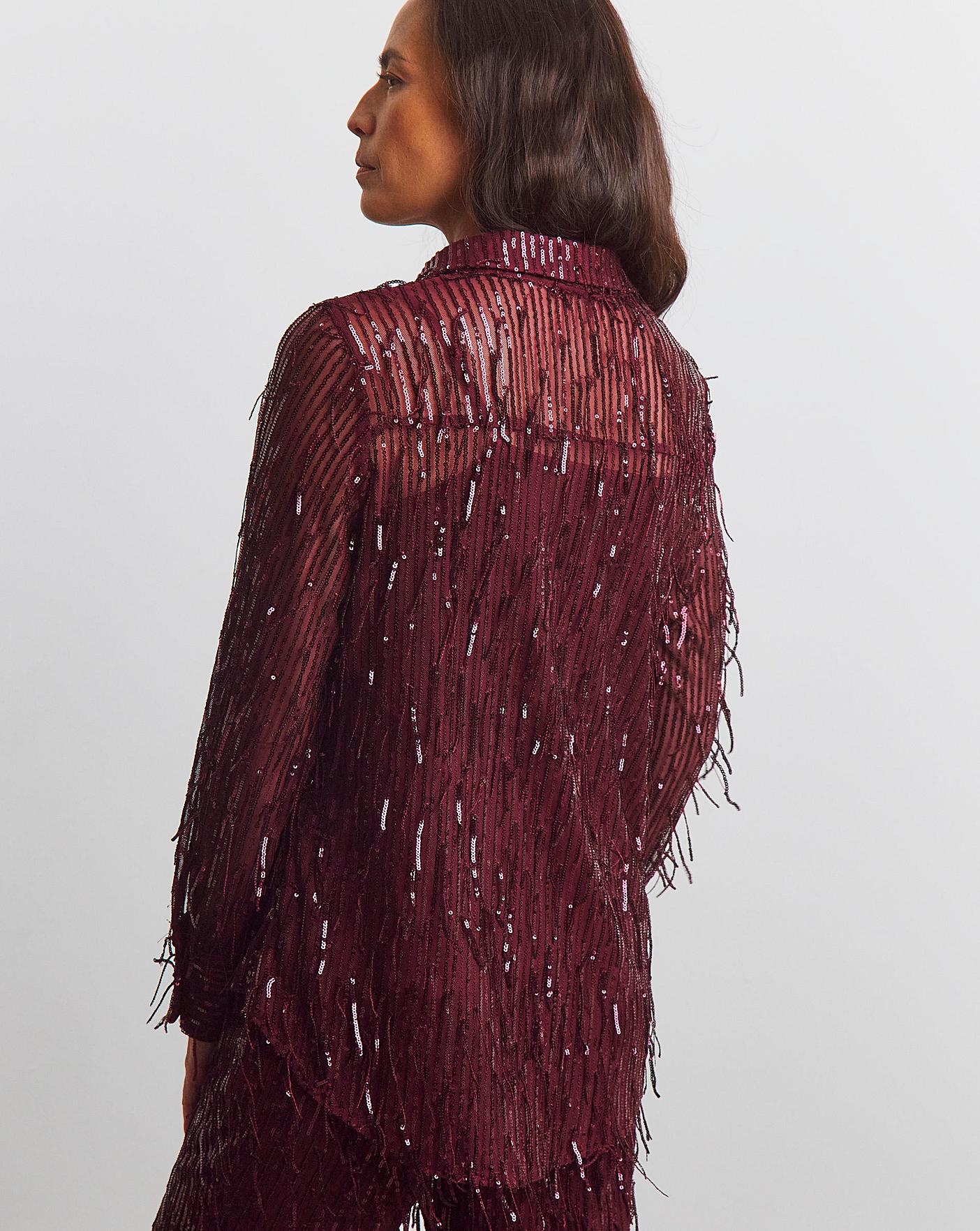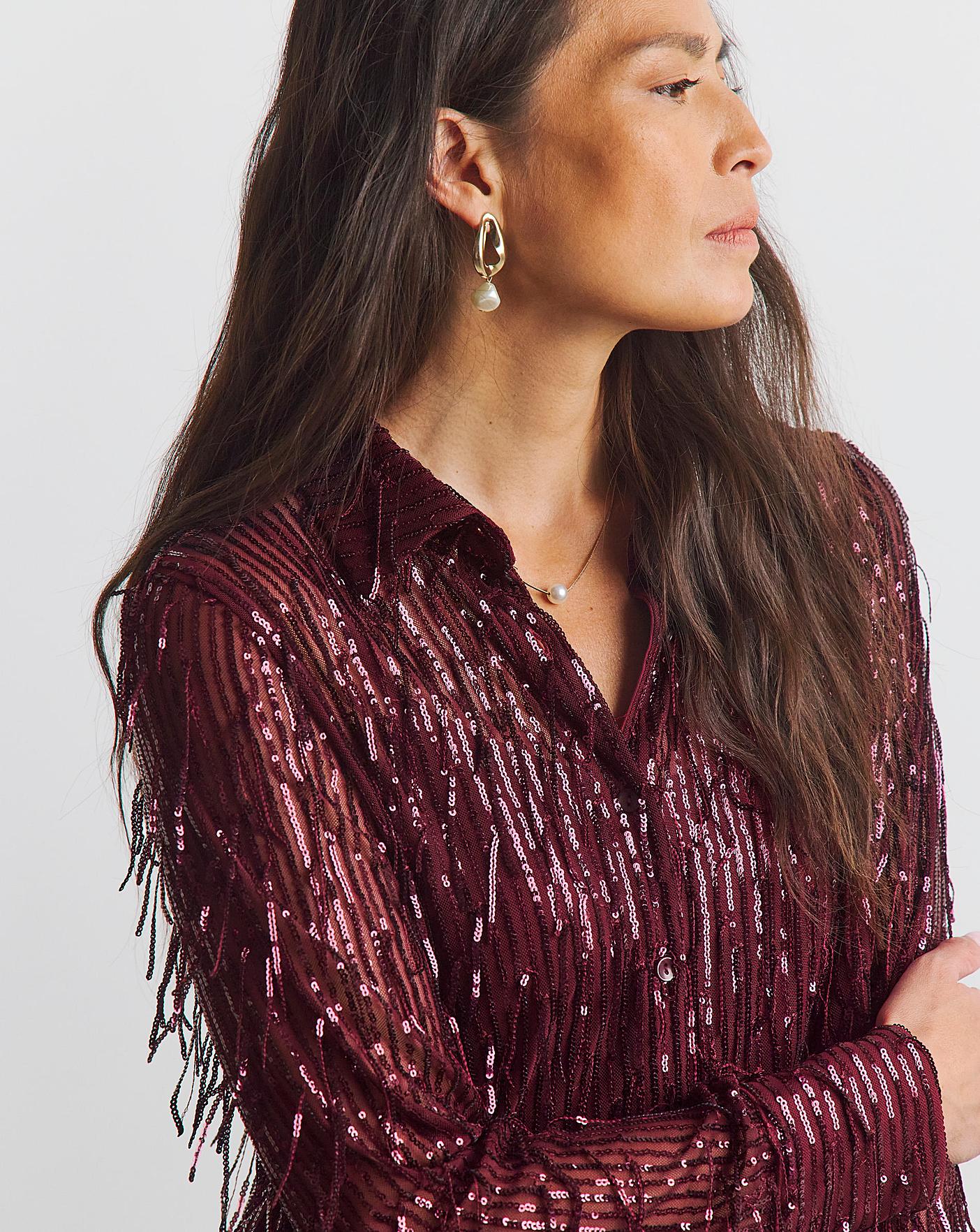 Wow others at your next event in this statement Sequin Tassel Shirt! This shirt features long sleeves and a collared v neckline.