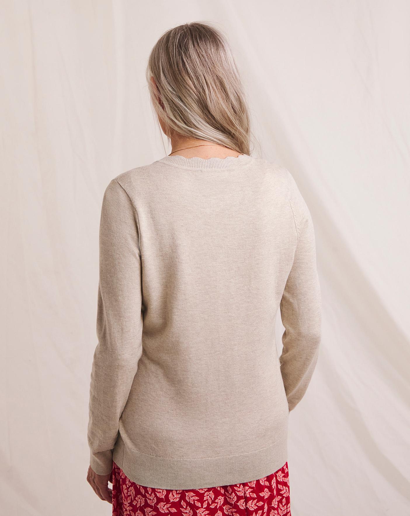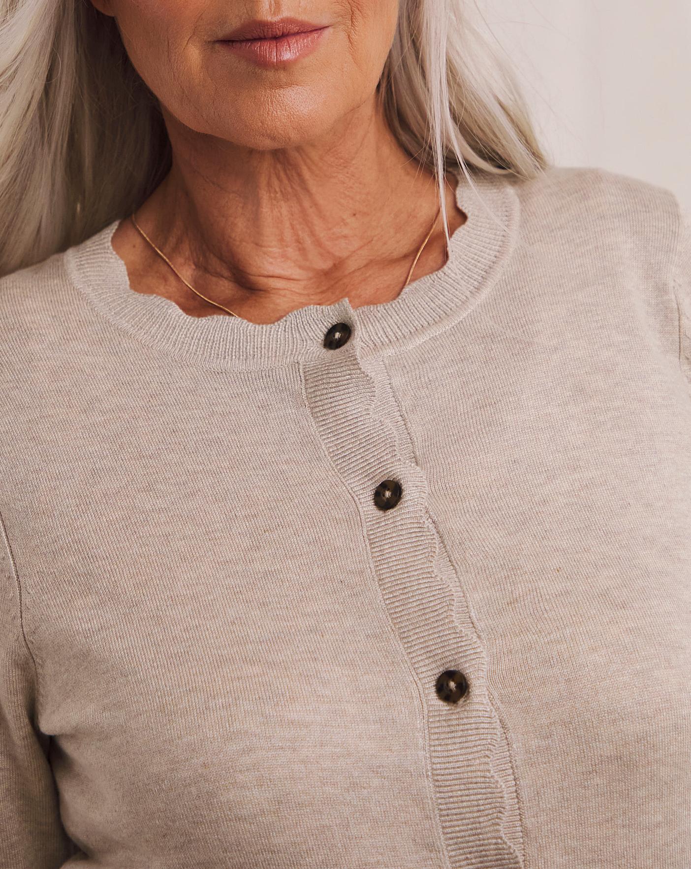 This scallope edge cardigan is the perfect layering piece for any outfit. Featuring button down fastening, round neckline, scallop edge detailing, and long sleeves.