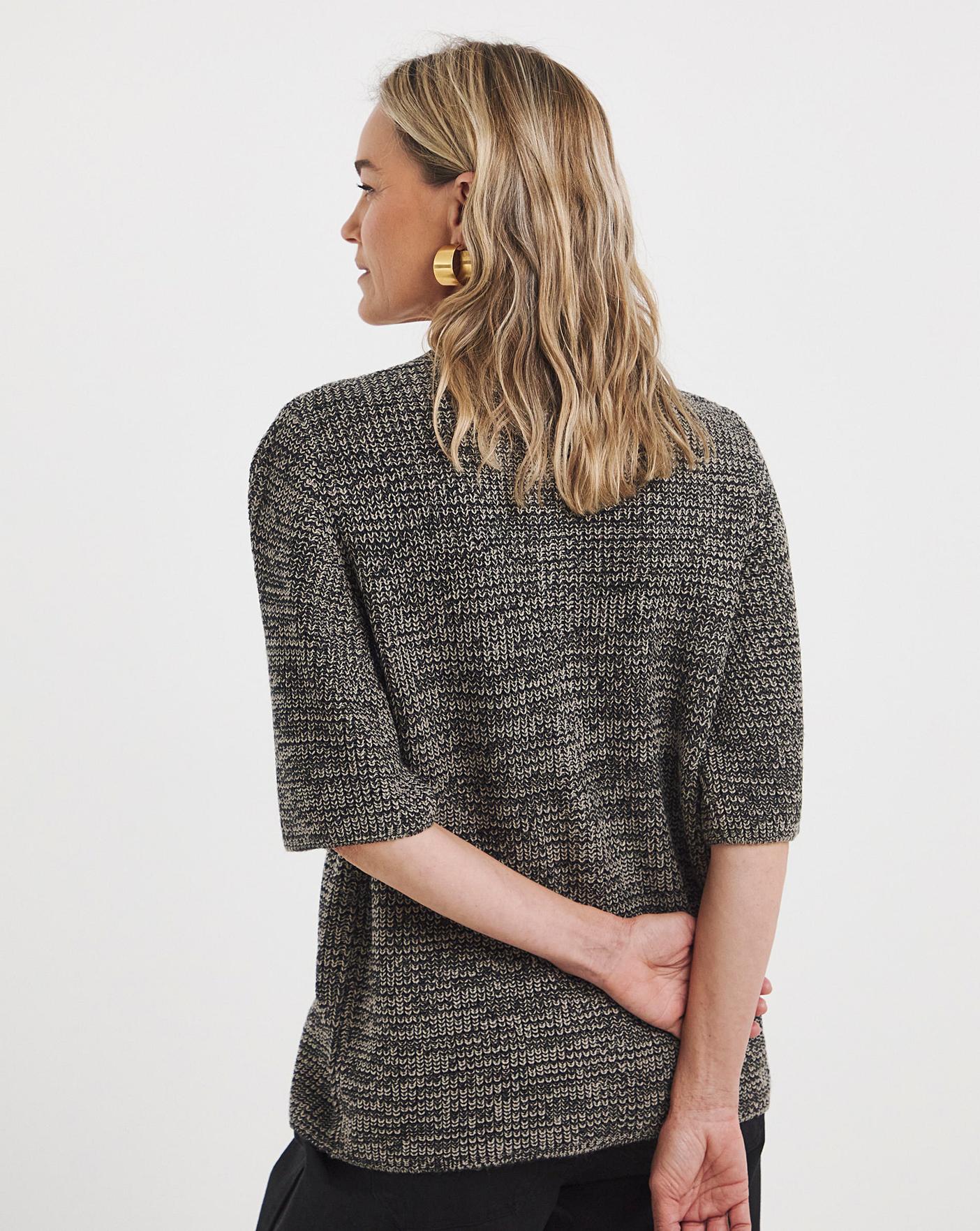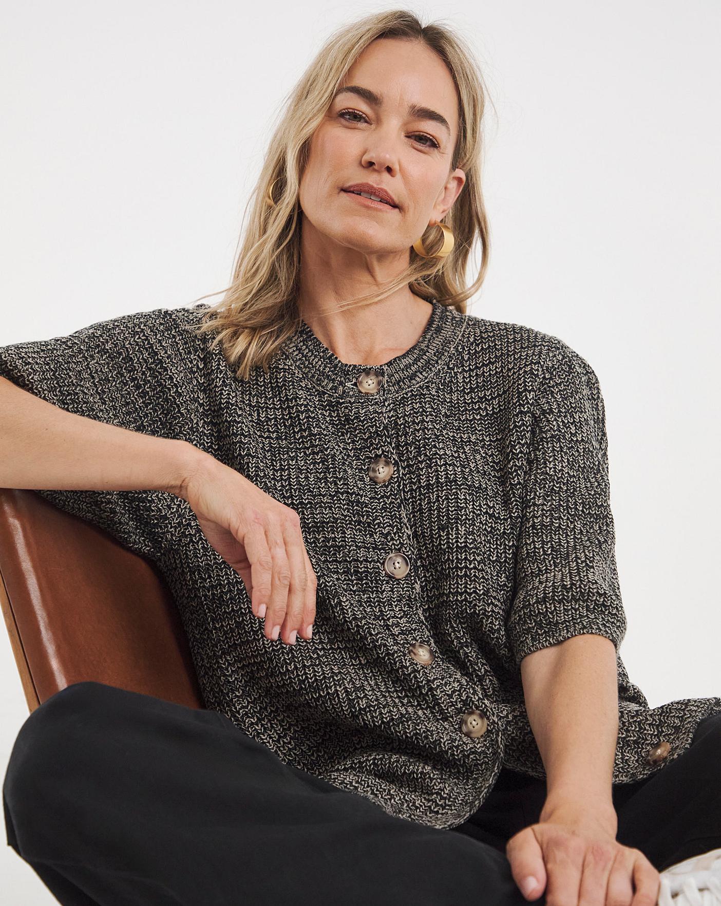 This cardigan comes in a mono colourway featuring a crew neck, half sleeves and a boxy fit.