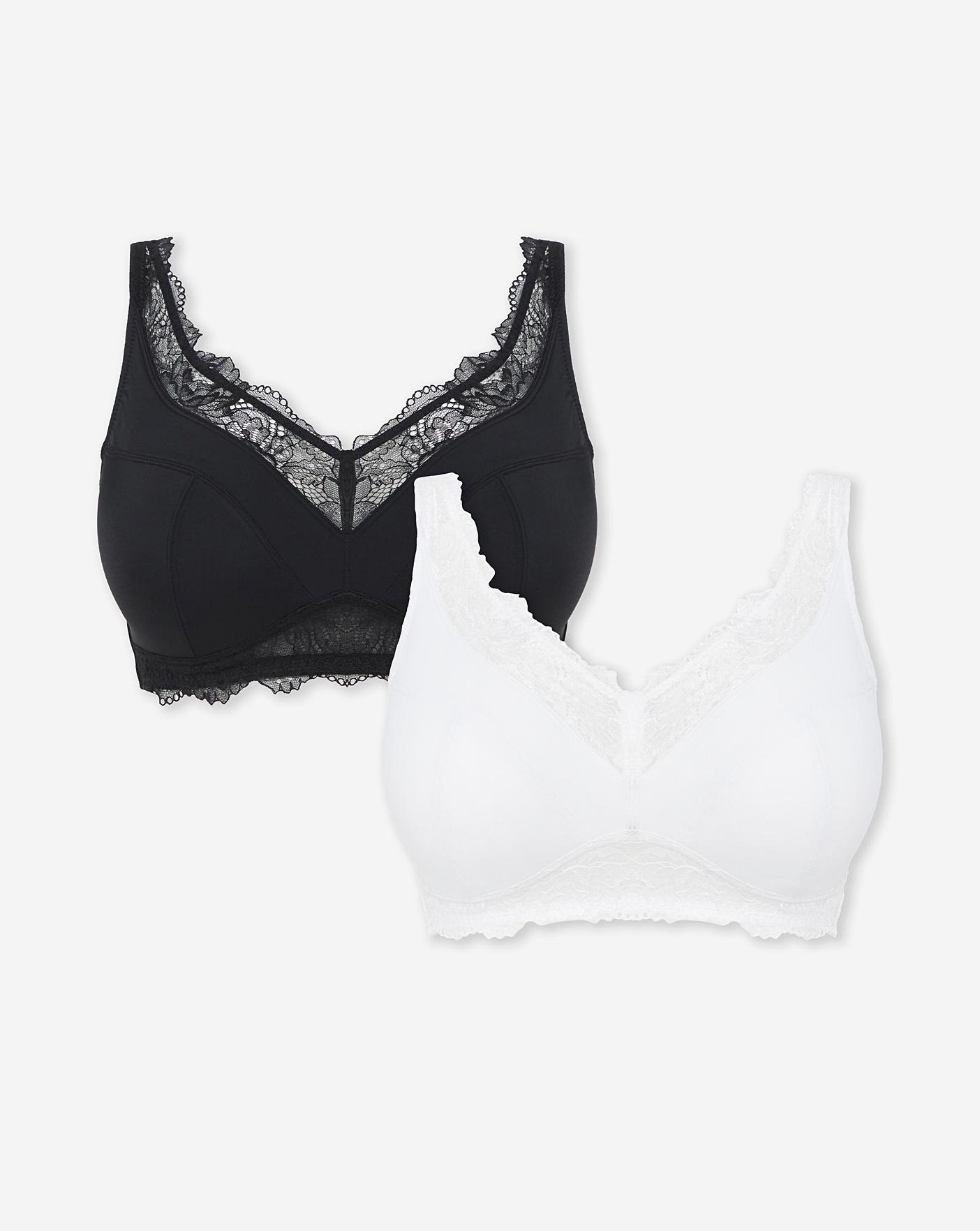 Updated for this season, our Ella range is better than ever and remains your trusty everyday essentials to provide optimal support whilst offering a feminine touch. Ella Full Cup Non-Wired Bralette provides a natural silhouette and supportive fit with non-wired, non-padded full cups. Non-wired, non-padded full cups. Luxurious signature Ella lace. New embossed Ella golden hardware. Hook-and-eye fastening. Adjustable straps. Comfortable and supportive fit. Soft microfiber fabric. This multipack contains x1 black and x1 white Ella Non Wired Full Cup Bralettes. Pair with the matching full brief knickers to complete this beautiful set and shop the rest of the Ella range for more colours and styles.