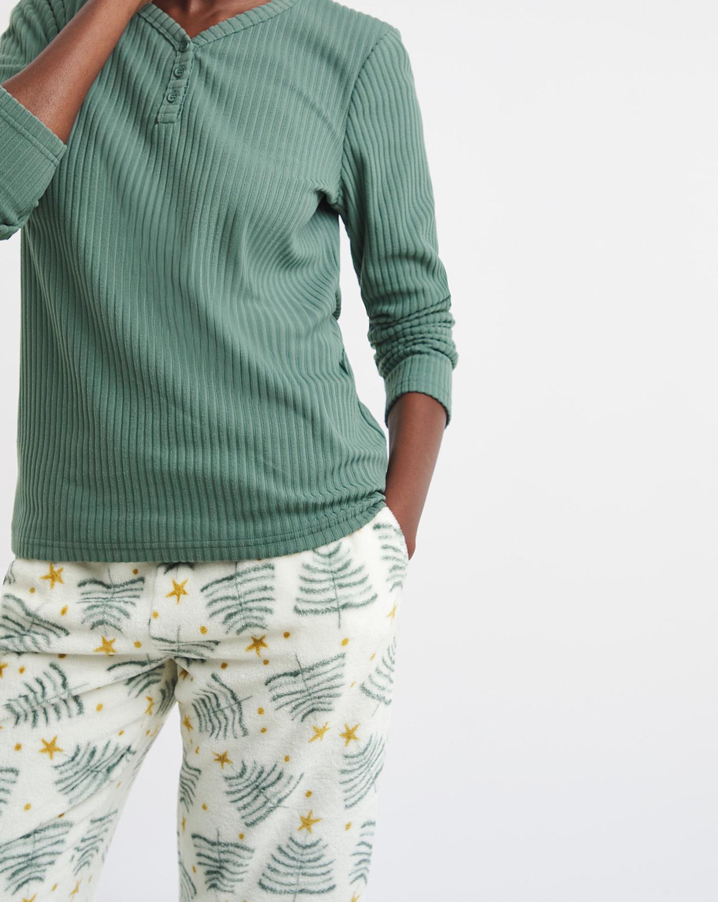 Add to your comfy & stylish favourites with this pyjama set. This pyjama has a regular fit. It comprises of a henley top and fleece pyjama bottoms. The top has is a lovely green colour and the pants are a christmas tree print. Our pyjama range offers versatile styles in modern shapes with unique details. Shop our range online now, in multiple prints & colourways.
