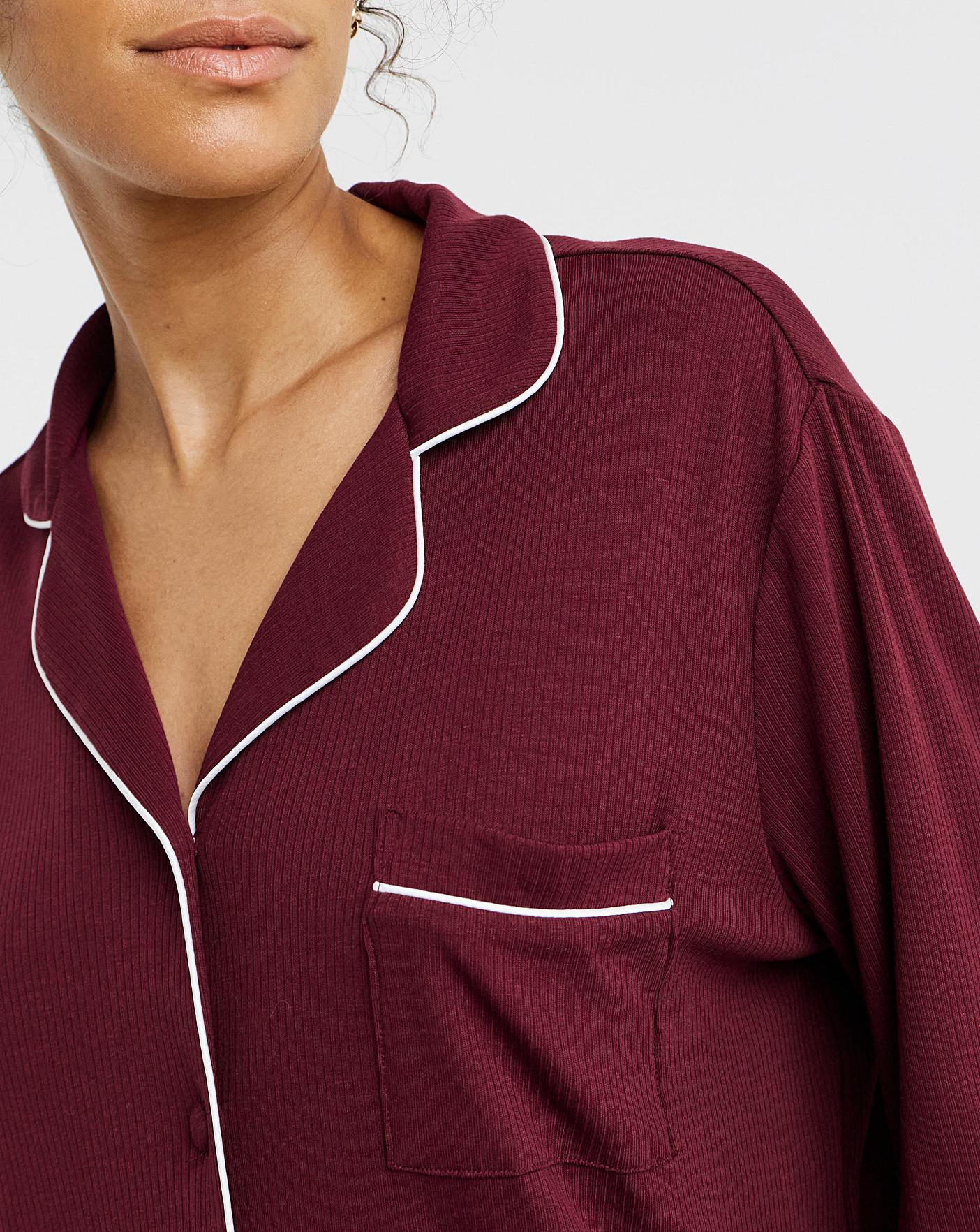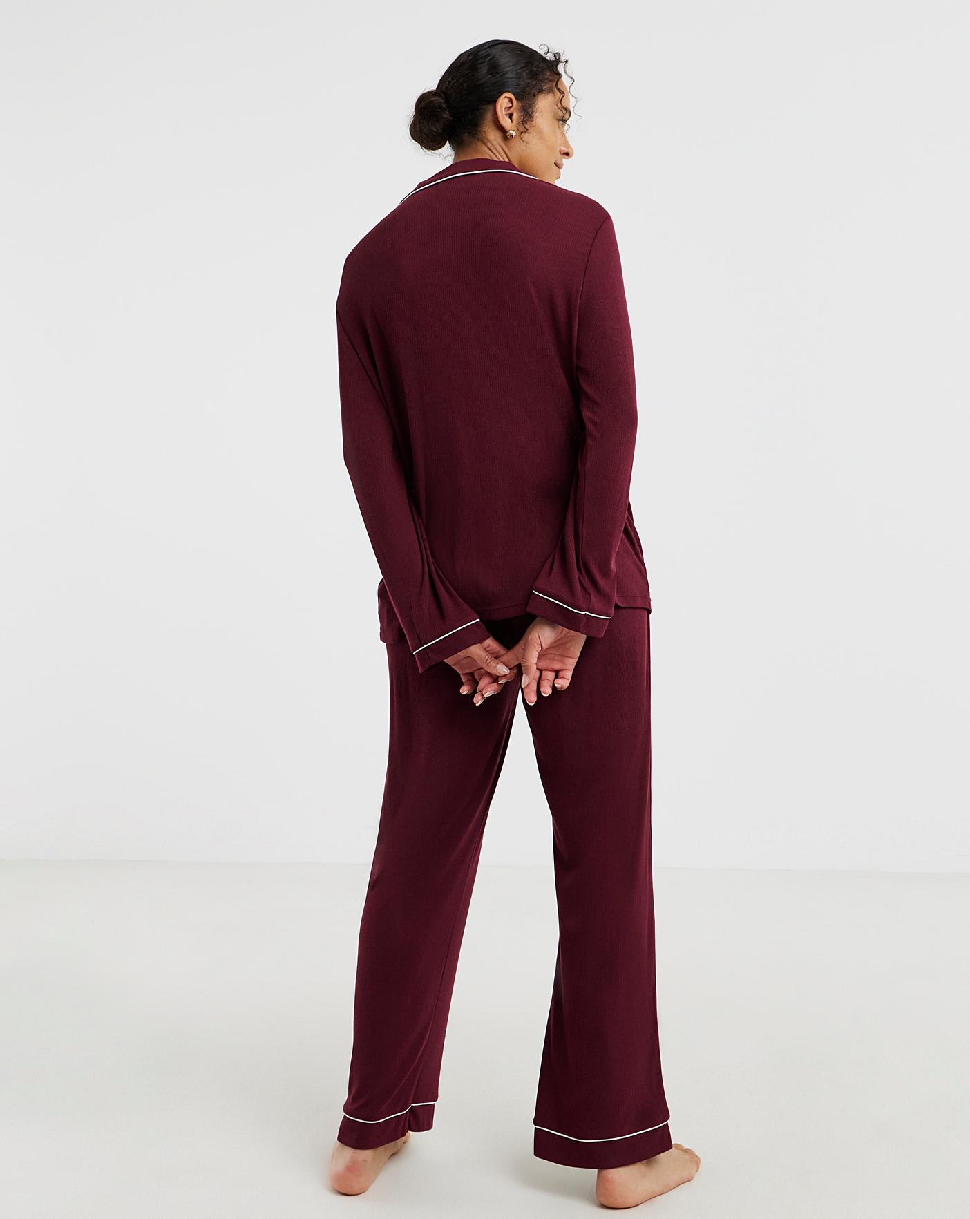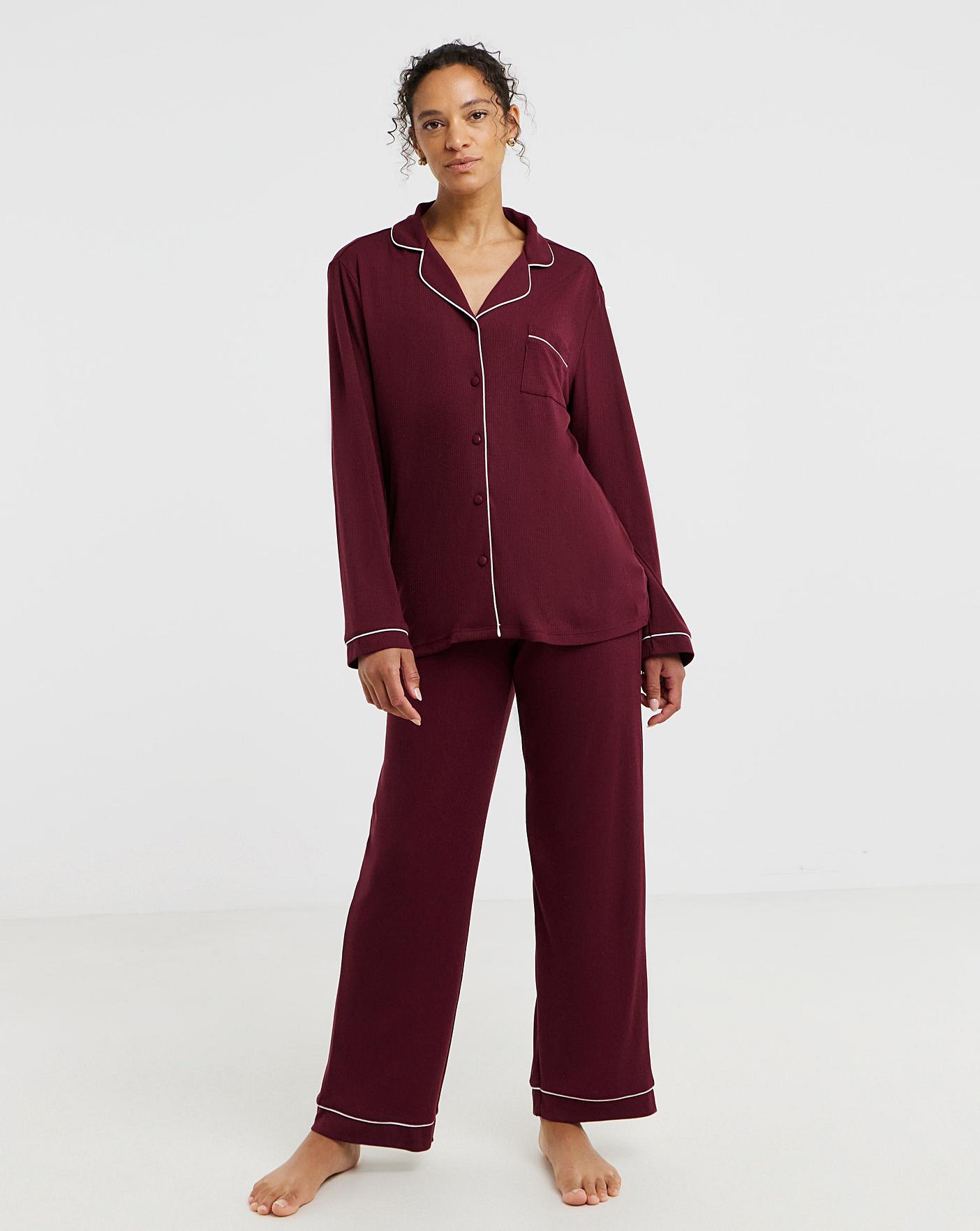 A classic shape and colour for this season, our button through ribbed pyjama set is ideal for colder nights with soft and stretchy fabric to keep you comfy. Neat regular fit. Long Sleeves. Full-length bottoms. Gorgeous burgundy colour. Button-fastened top with soft revere collar. Drawcord at the elasticated waistband lets you find your perfect fit. Soft ribbed fabric. All of our pyjamas are designed with fit in mind, for guaranteed comfort. Shop our range online now, in multiple prints & colourways.