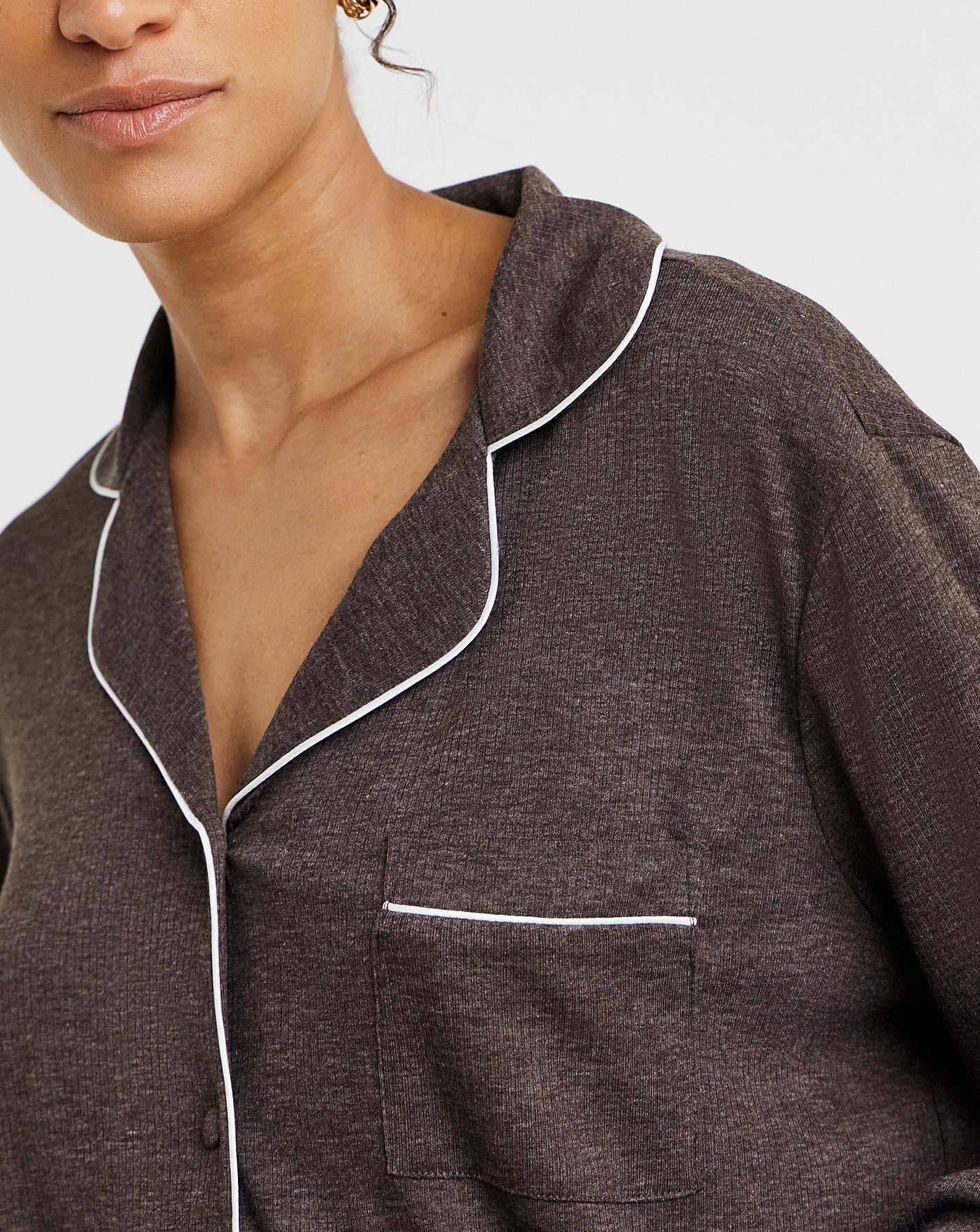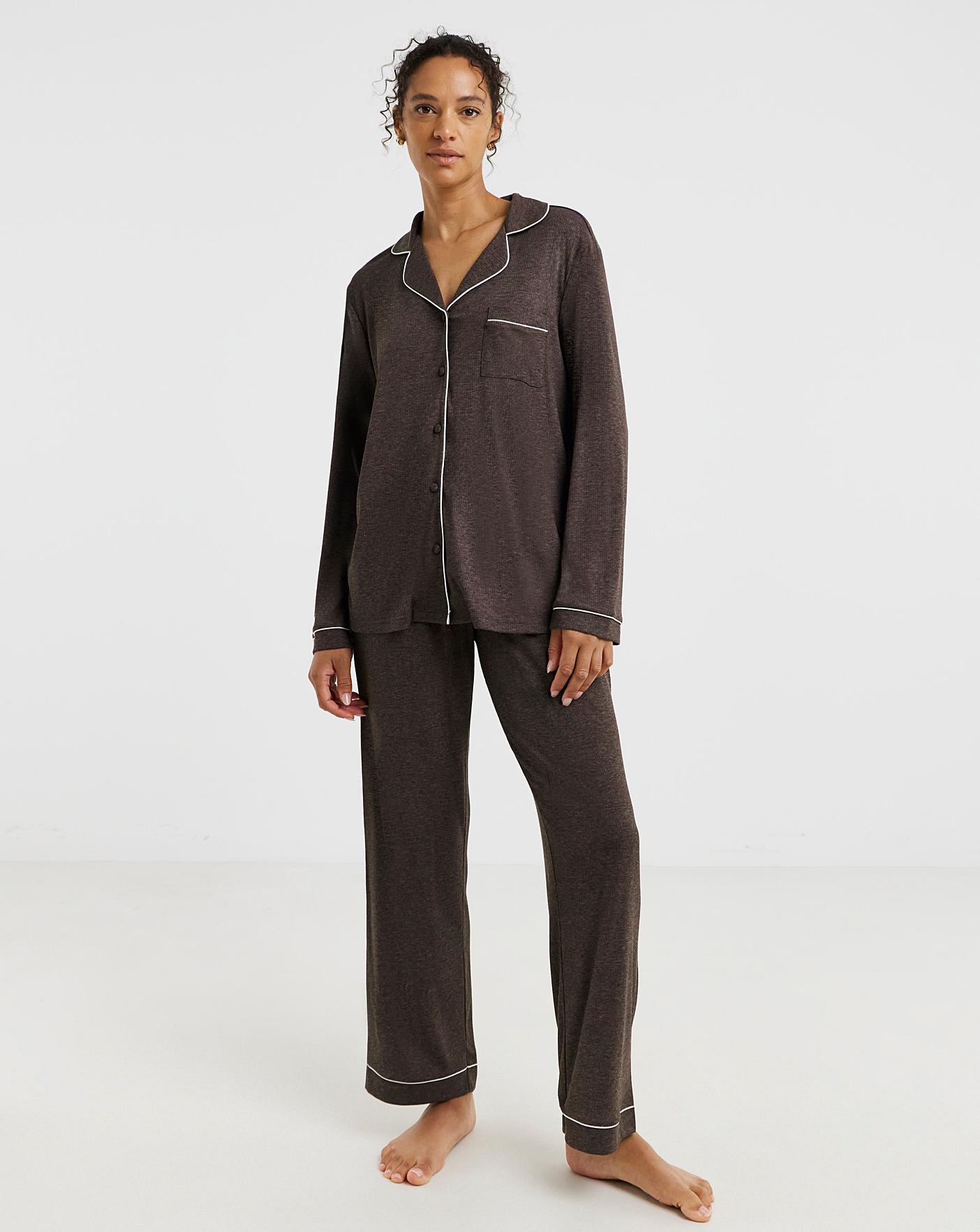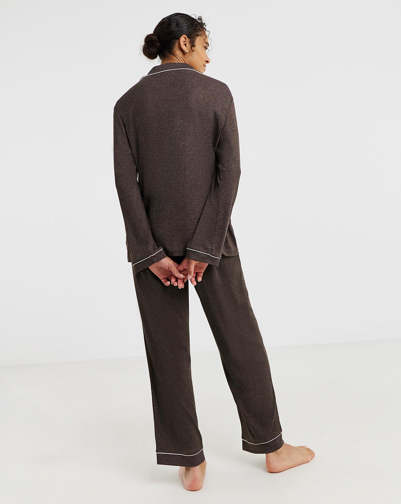 A classic shape and colour for this season, our button through ribbed pyjama set is ideal for colder nights with soft and stretchy fabric to keep you comfy. Neat regular fit. Long Sleeves. Full-length bottoms. Gorgeous neutral brown colour. Button-fastened top with soft revere collar. Drawcord at the elasticated waistband lets you find your perfect fit. Soft ribbed fabric. All of our pyjamas are designed with fit in mind, for guaranteed comfort. Shop our range online now, in multiple prints & colourways