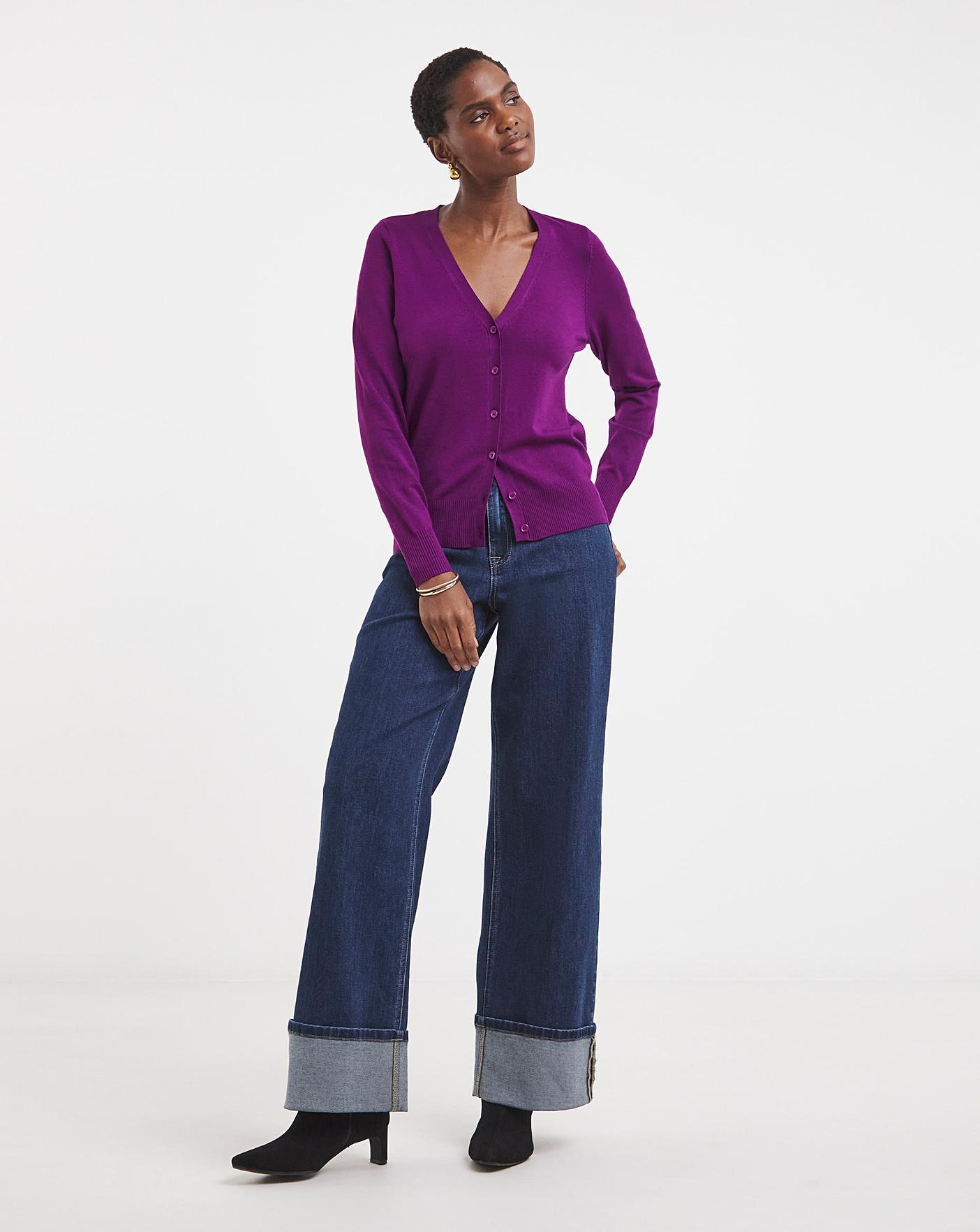 This cardigan in purple features a flattering v neckline, long sleeves and a regular fit.