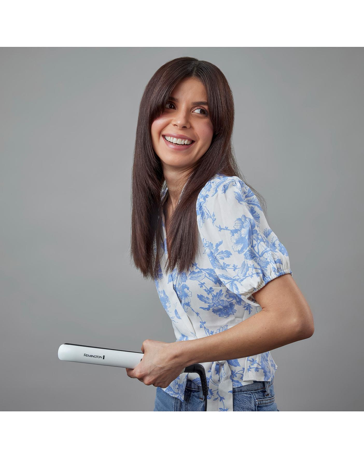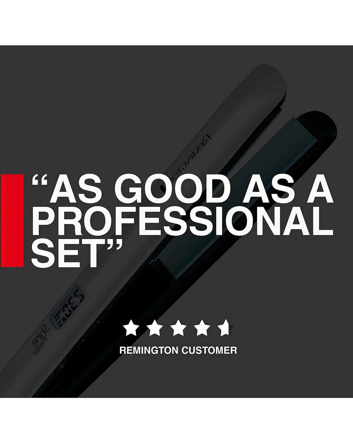 The Remington S8500 Shine Therapy Straightener boasts Advanced Ceramic coated plates infused with Moroccan argan oil, as well as Vitamin E, leaving your hair looking intensely glossy and in 88% better condition. Features nine different temperature settings from 150 to 230°C, floating plates, 15 second heat-up time, turbo boost function, temperature lock function and auto shut-off after 60 minutes. Includes plate lock for storage and heat-resistant pouch. Worldwide voltage. Swivel cord.