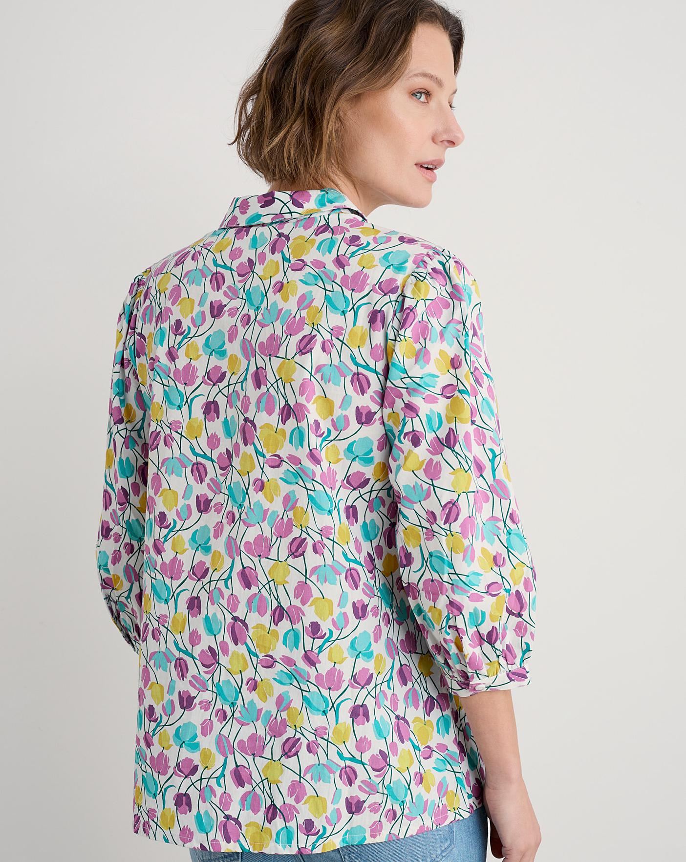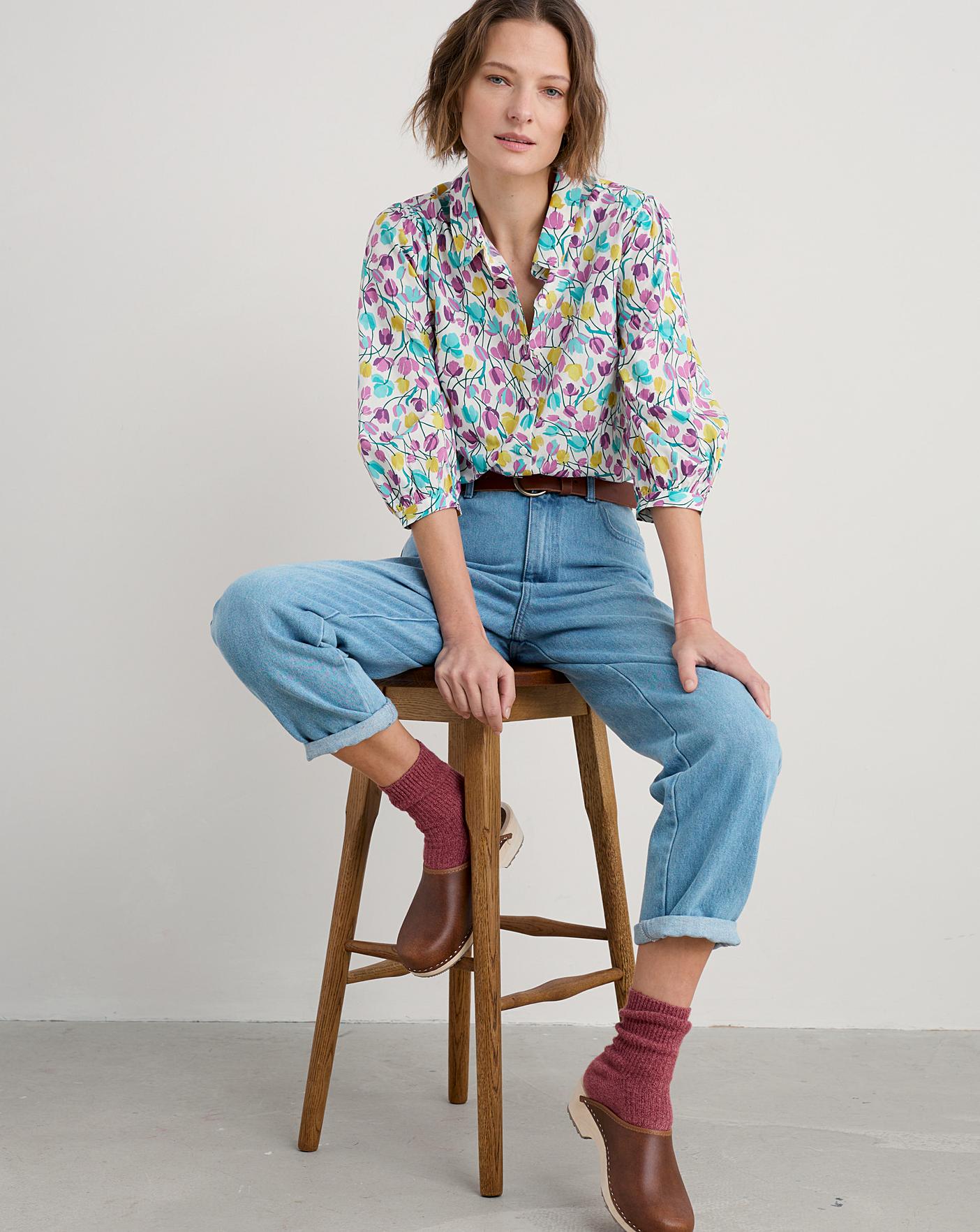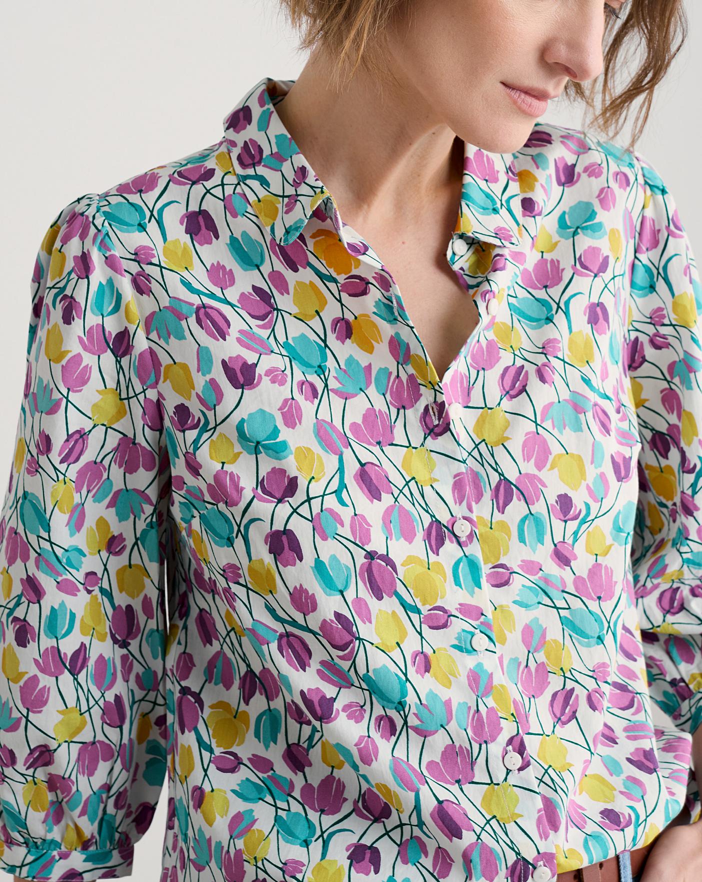 Soft, breathable organic cotton blouse with a floral print, blouson sleeves and a peter pan collar.