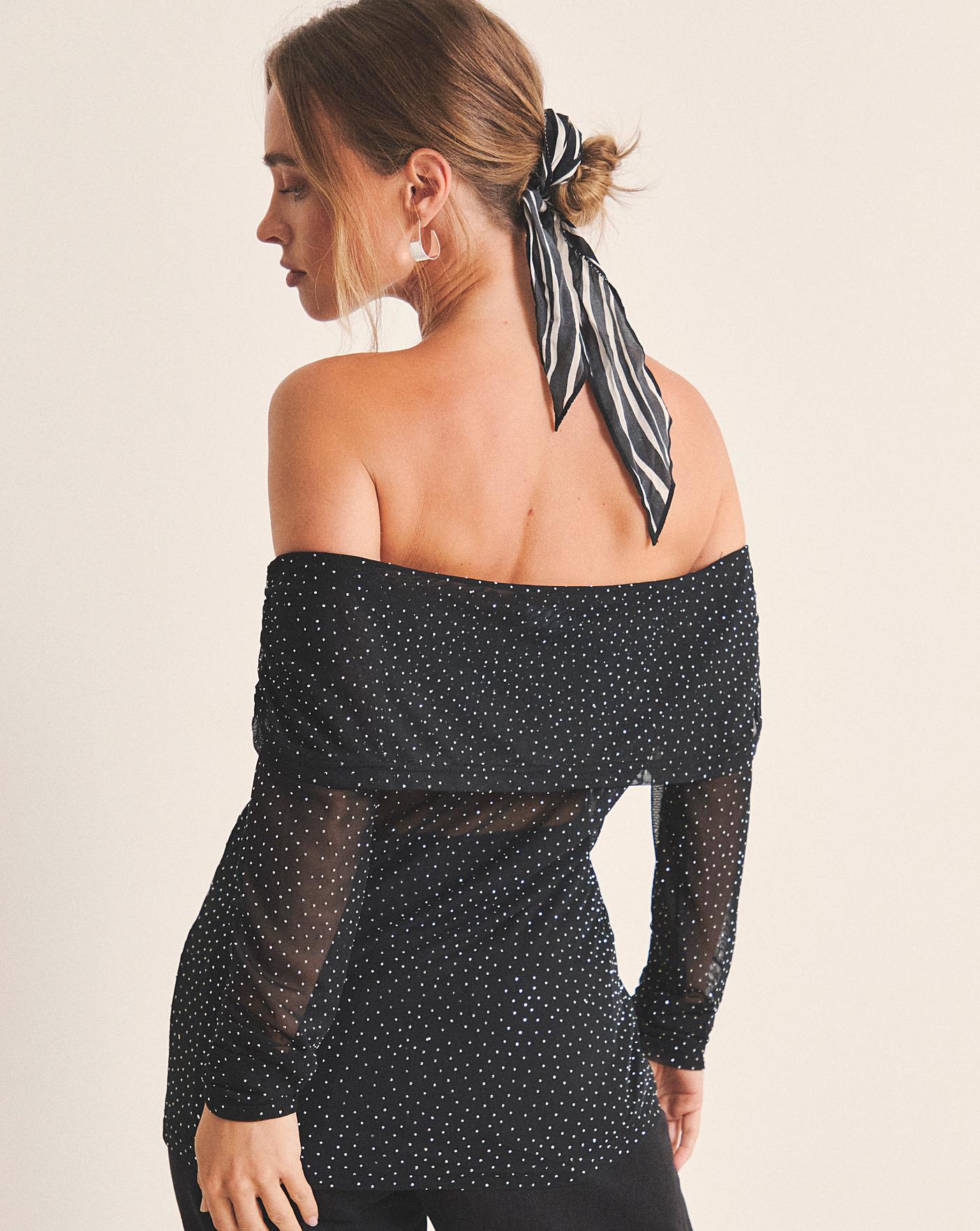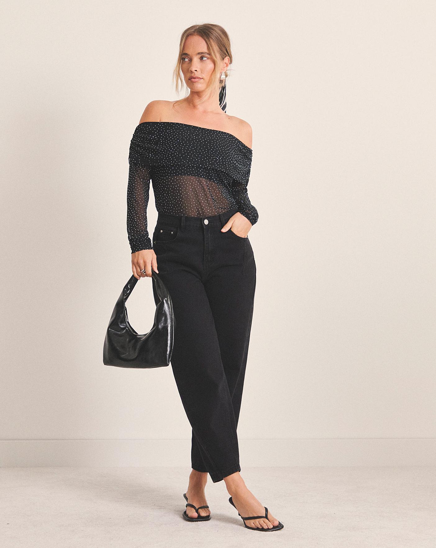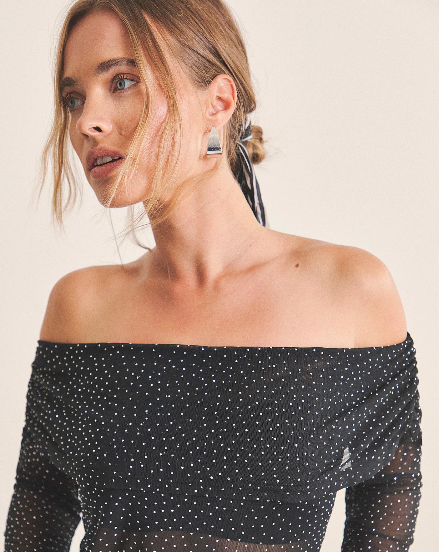 Get ready for party season with our Black Diamante Hot Fix Bardot Top. Off the shoulder necklineLong sleevesSheer mesh, stretch jersey fabricDiamante embellishmentFlattering slim fit. Pair with a satin skirt for the perfect party look.