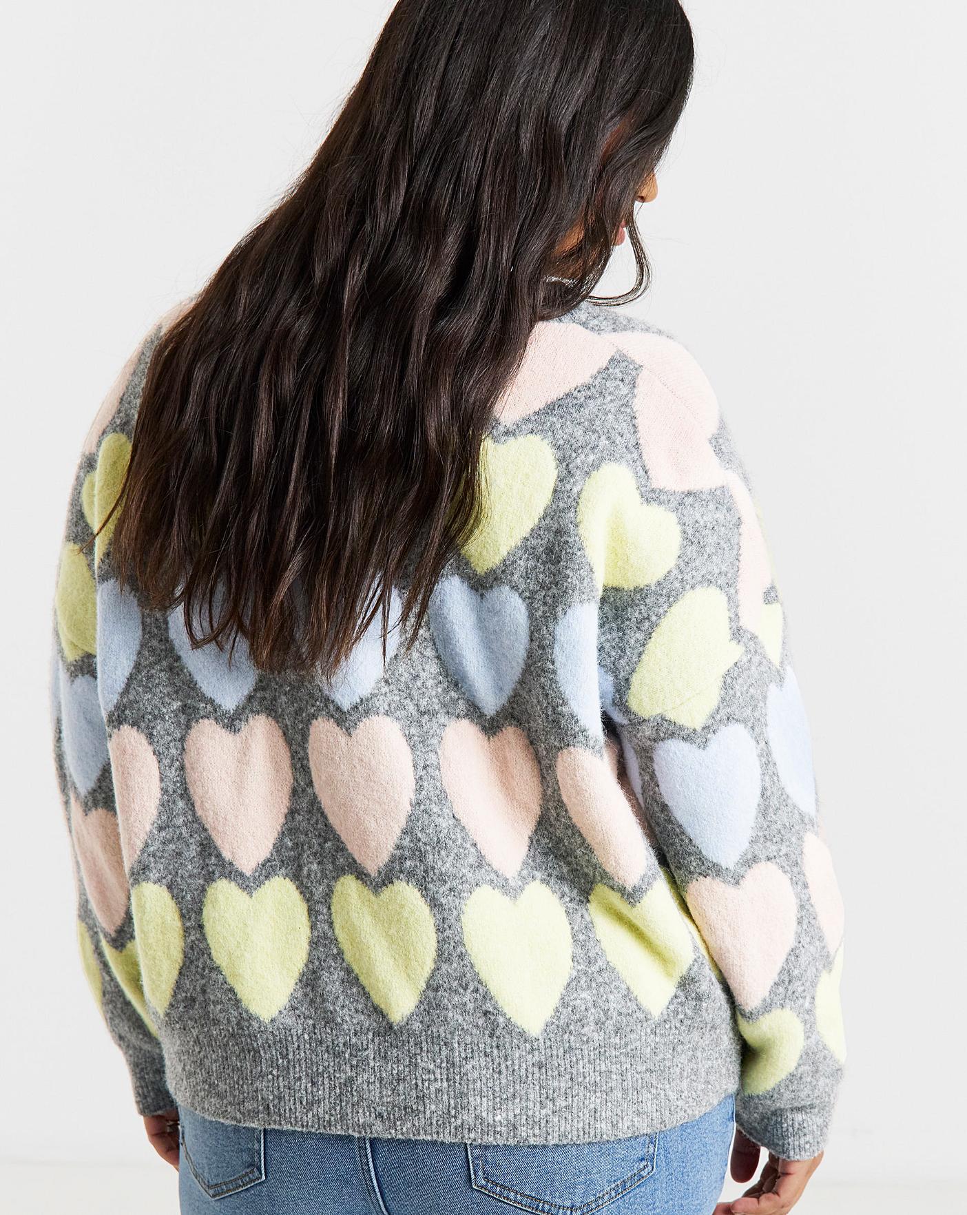 Our heart print boyfriend cardigan is soft, cosy and full of personality. It's the perfect piece to brighten up your everyday style. In an all over heart print pattern, soft knit with a relaxed fit, a classic v-neckline, button up front perfect for layering, playful but easy to wear. Pair with your favourite jeans or layer over a dress for a fun look.