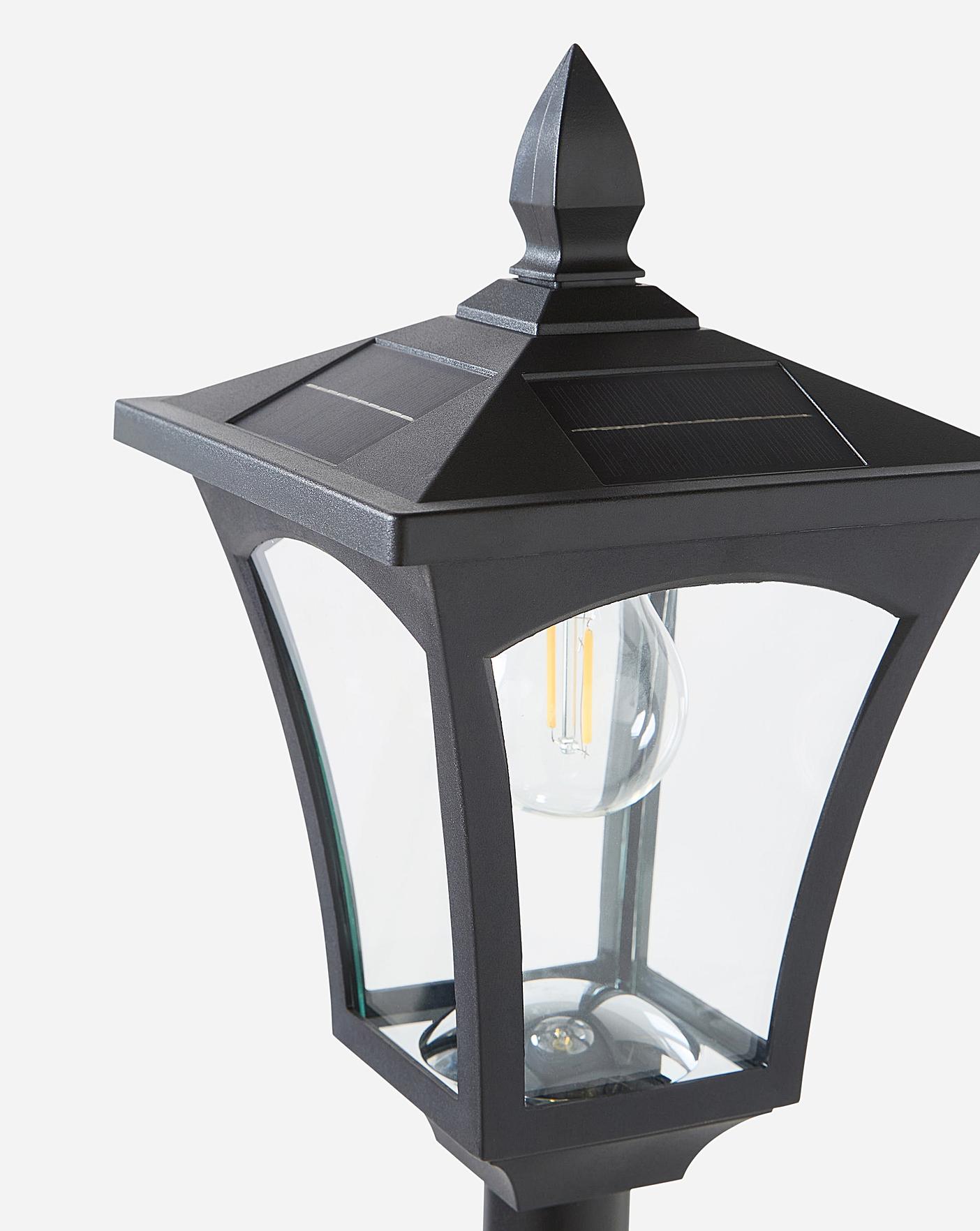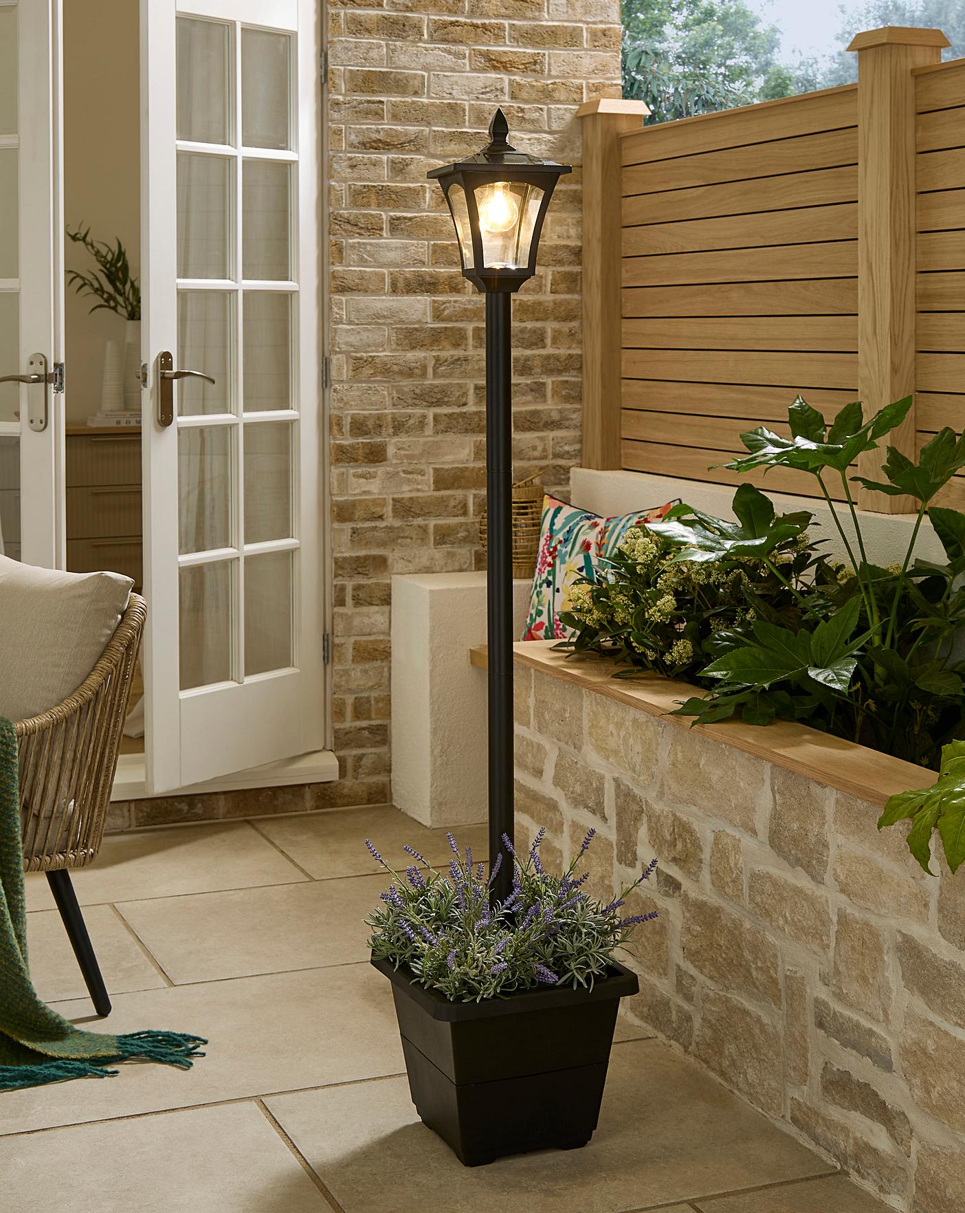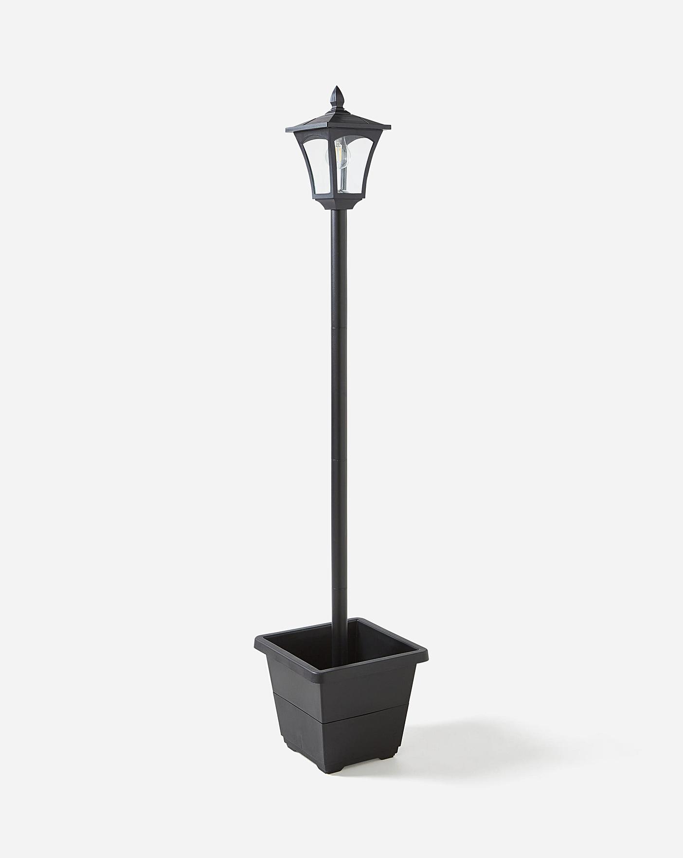 1.8m tall Garden Lamp Post set into a plastic planter that Is durable and easy to install. Four solar panels on the top of the lantern will automatically charge during bright days over a period of 6-8 hours, offering 8 to 10 hours of warm white LED lantern lamplight. Planter measures W32 x D32 x H28cm and the lantern measures 18 x 18cm. 1 Year manufacturers warranty.