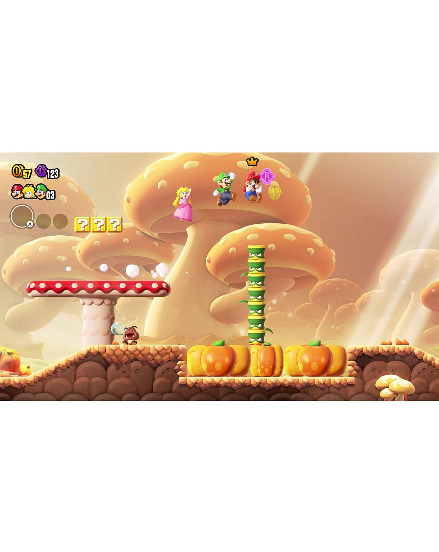 Step into a world of wonder in Super Mario Bros. Wonder for Nintendo Switch! Classic Mario side-scrolling gameplay is turned on its head with the addition of Wonder Flowers! These game-changing items trigger spectacular moments you have to see to believe. Witness pipes coming alive, wreak havoc as a giant spiky ball, and see even more unexpected events called Wonder Effects. Pick from heroic Super Mario characters and Power-Ups. Choose from familiar characters including Mario, Luigi, Peach, Daisy, Yoshi and Toad. Transform into Elephant Mario to use your trunk to trounce enemies with a surprising new Power-Up. Share the wonder with friends and Mario fans. Team up with up to three friends locally and gather around one Nintendo Switch console to experience the game-bending Wonder Effects together as you tackle courses as a team, and help each other on your way to the goal.